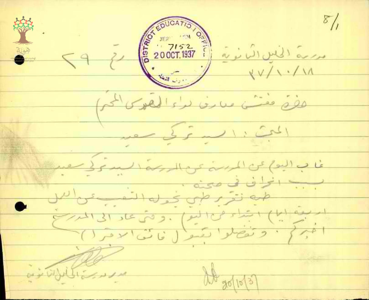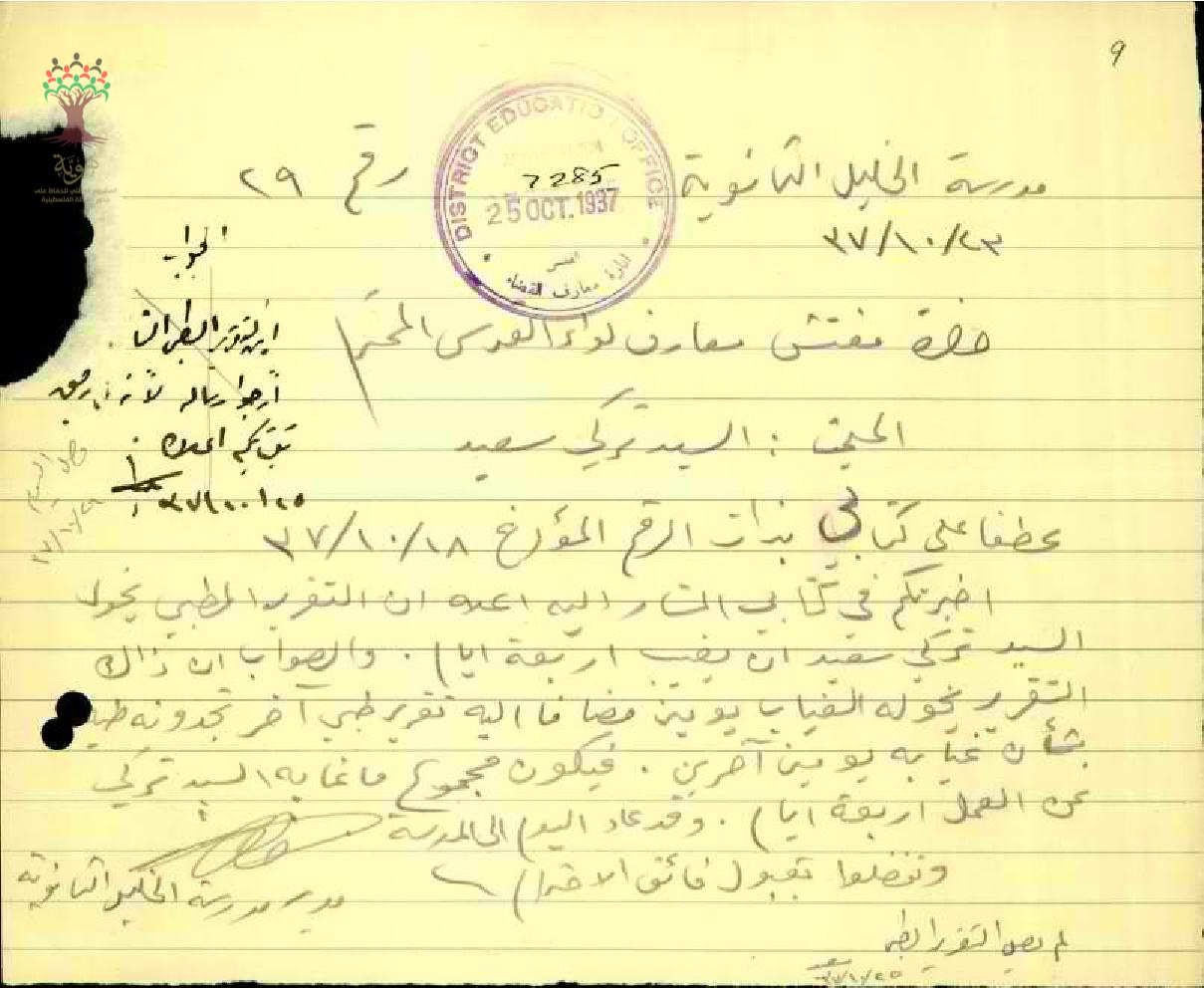 رسائل من مدير مدرسة الخليل الى مفتش المعارف بخصوص تغيب المعلم تركي سعيد وعودته الى العمل