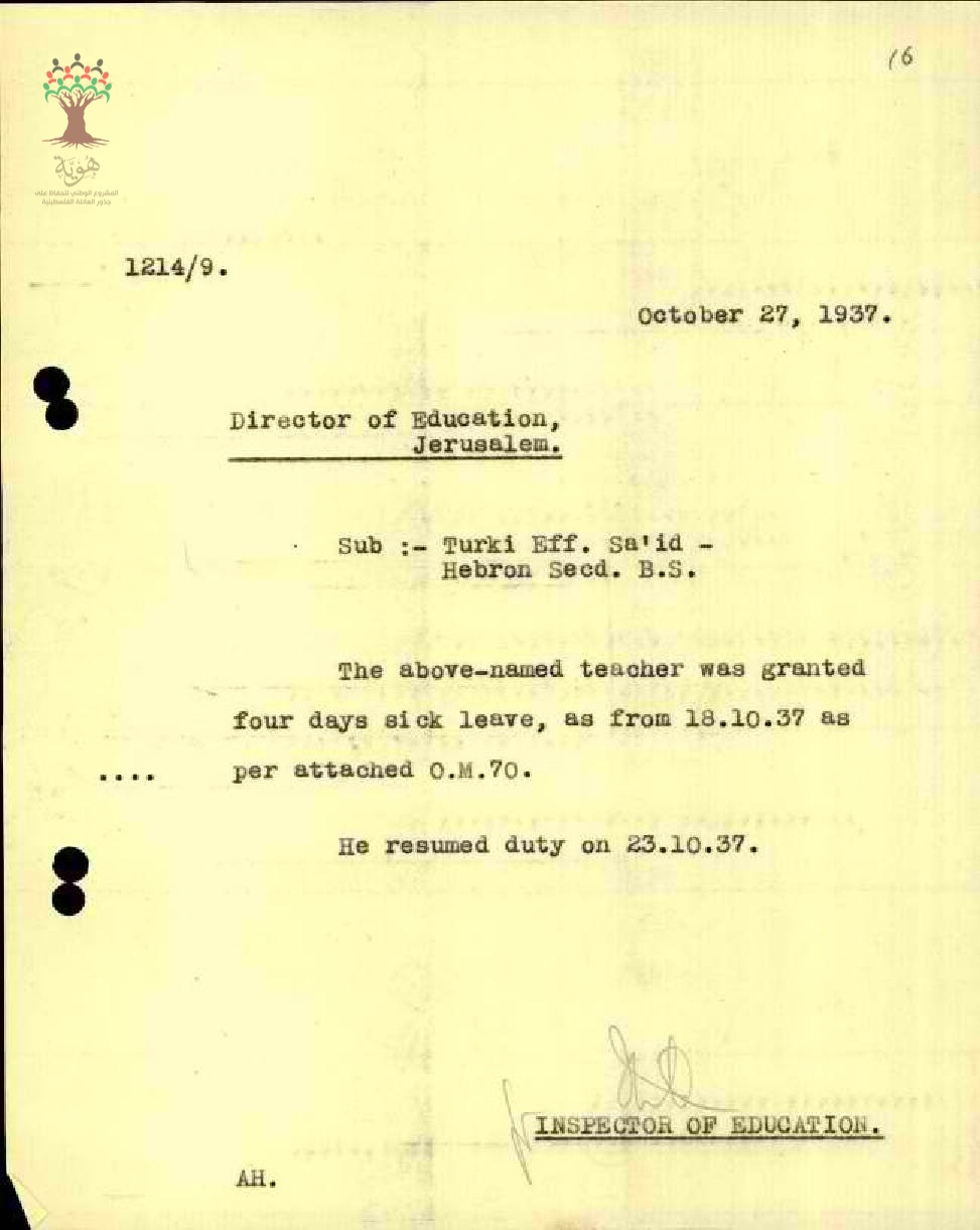 رسالة من مفتش المعارف الى مدير المعارف بخصوص اجازة مرضية للمعلم تركي سعيد وعودته للعمل