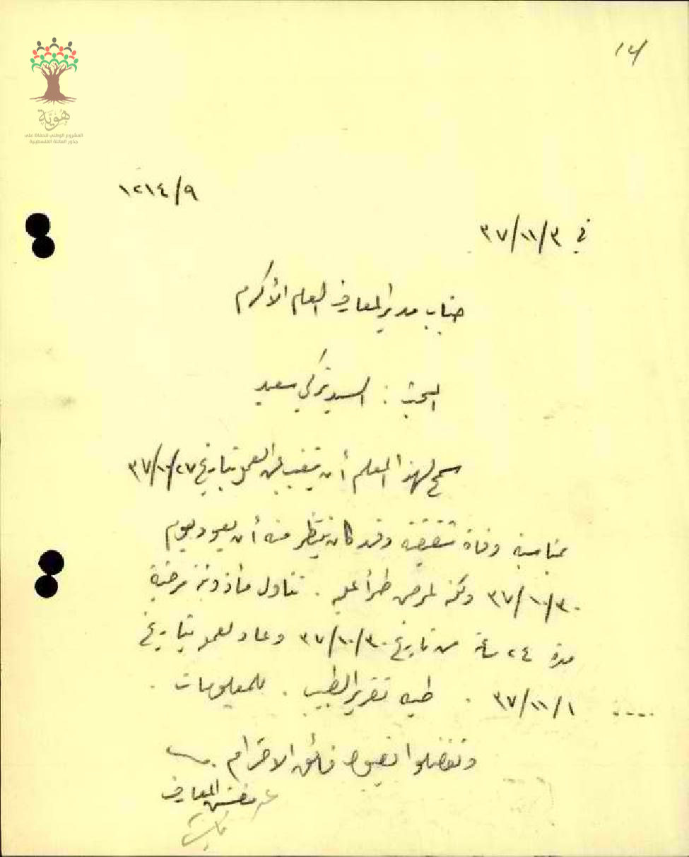 رسالة من مفتش المعارف الى مدير المعارف بخصوص تغيب المعلم تركي سعيد بسبب وفاة شقيقته واجازة بسبب المرض وعودته الى العمل