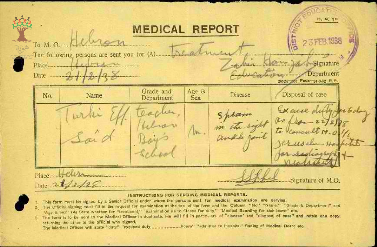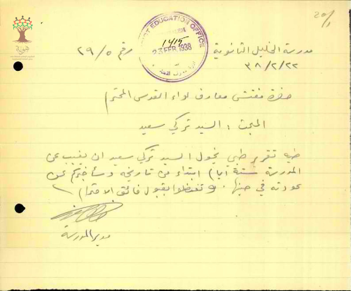 رسالة من مدير مدرسة الخليل الى مفتش المعارف بخصوص تغيب المعلم تركي سعيد مرفقة بالتقرير الطبي