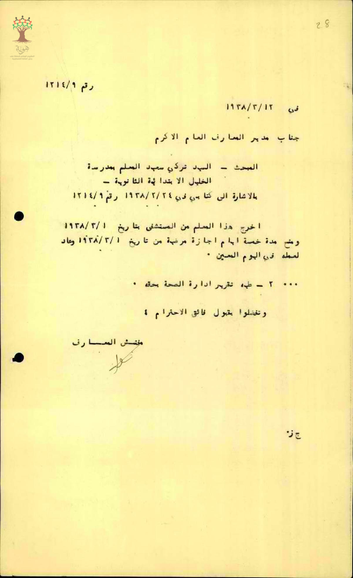 رسالة من مفتش المعارف الى مدير المعارف بخصوص عودة المعلم تركي سعيد الى العمل