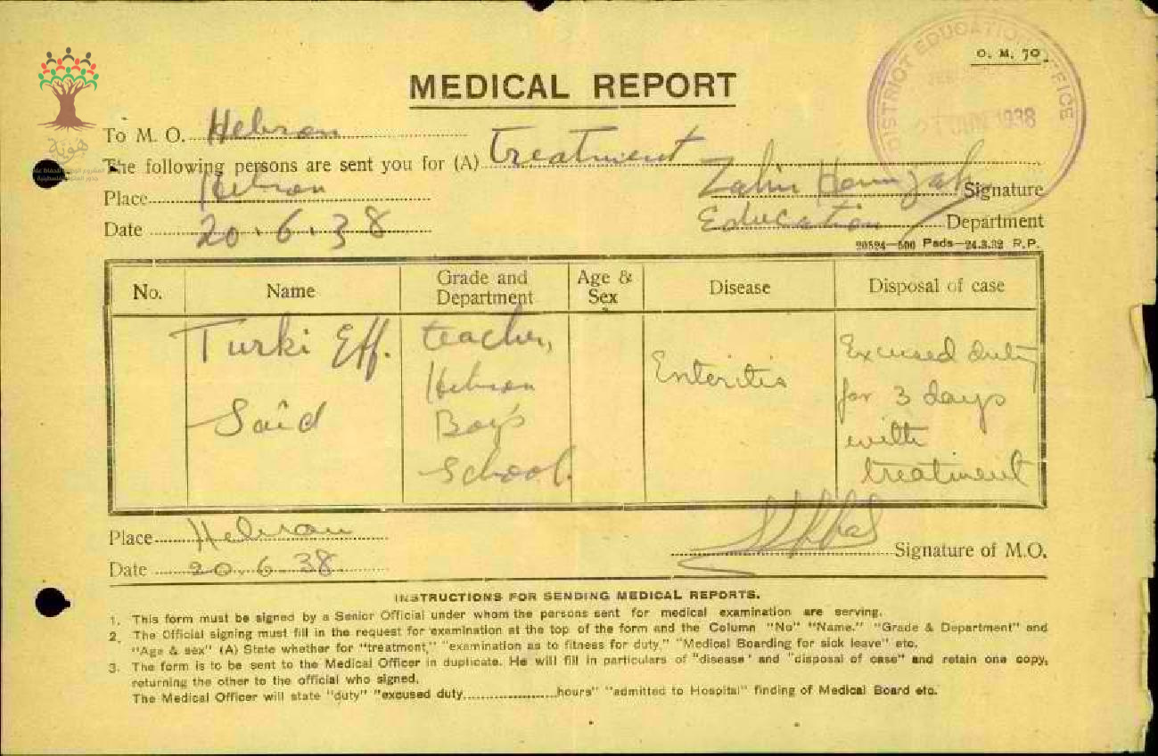 رسالة من مدير مدرسة الخليل الى مفتش المعارف بخصوص تغيب المعلم تركي سعيد مرفقة بالتقرير الطبي