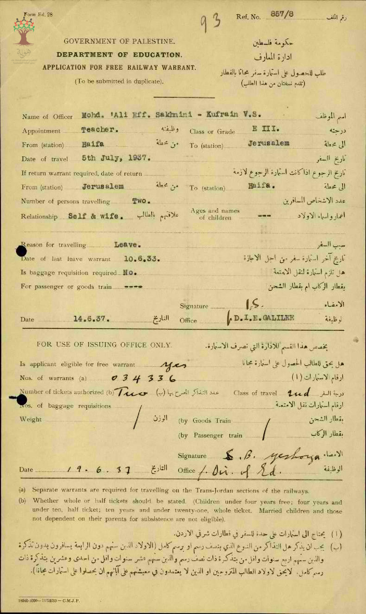 استمارة سفر المعلم محمد علي سخنيني - مدرسة الكفرين