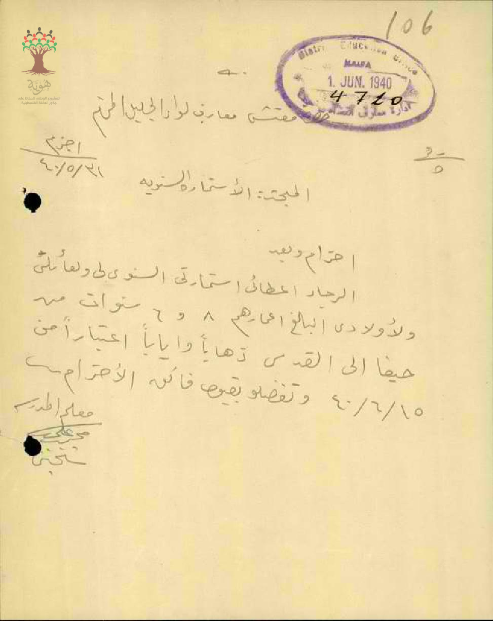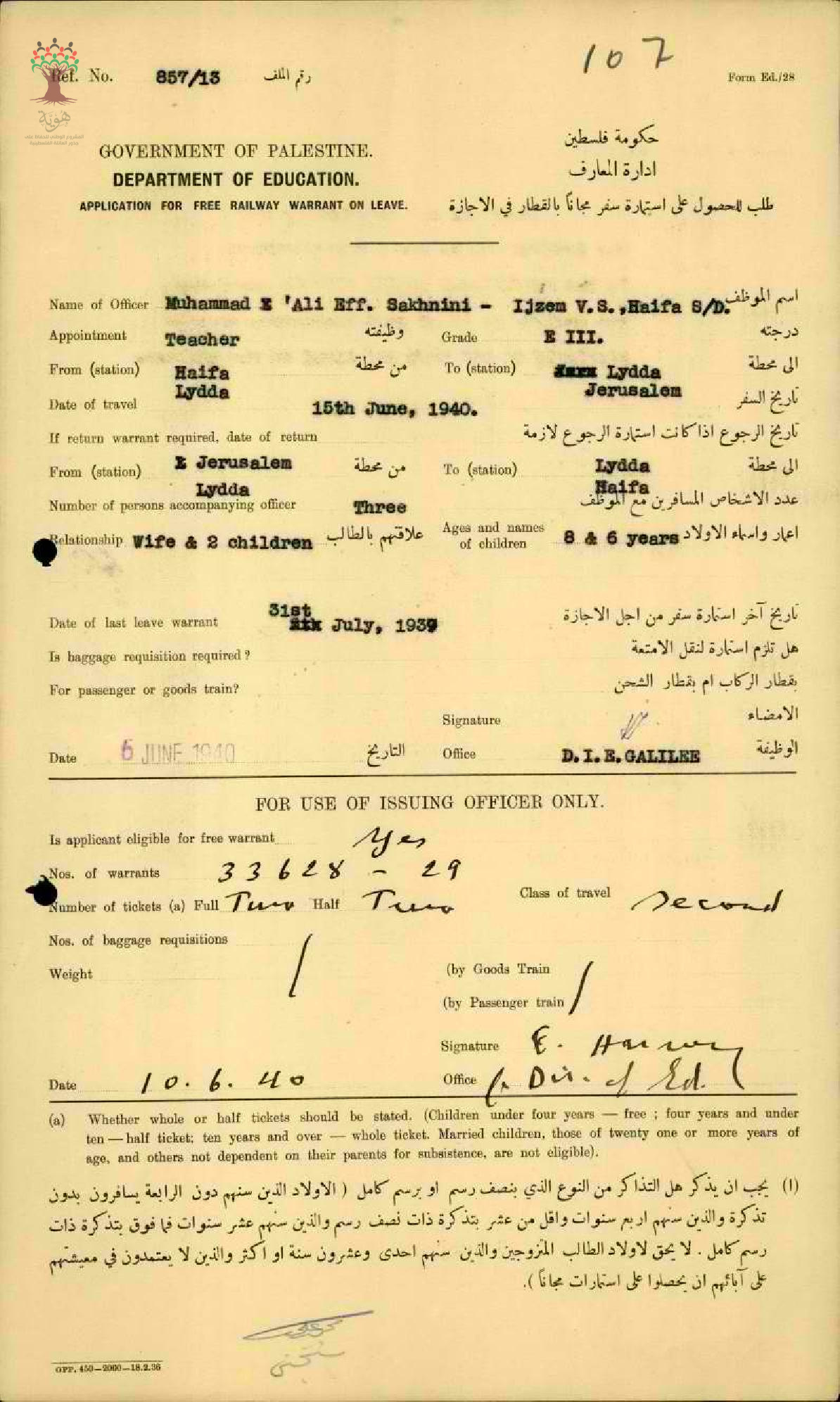 استمارة سفر من حيفا الى القدس المعلم محمد علي سخنيني - مدرسة اجزم