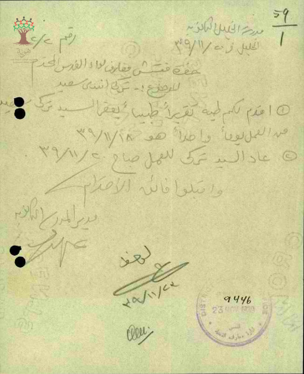 رسالة من مدير مدرسة الخليل الى مفتش المعارف بخصوص تغيب المعلم تركي سعيد مرفقة بالتقرير الطبي وعودته الى العمل