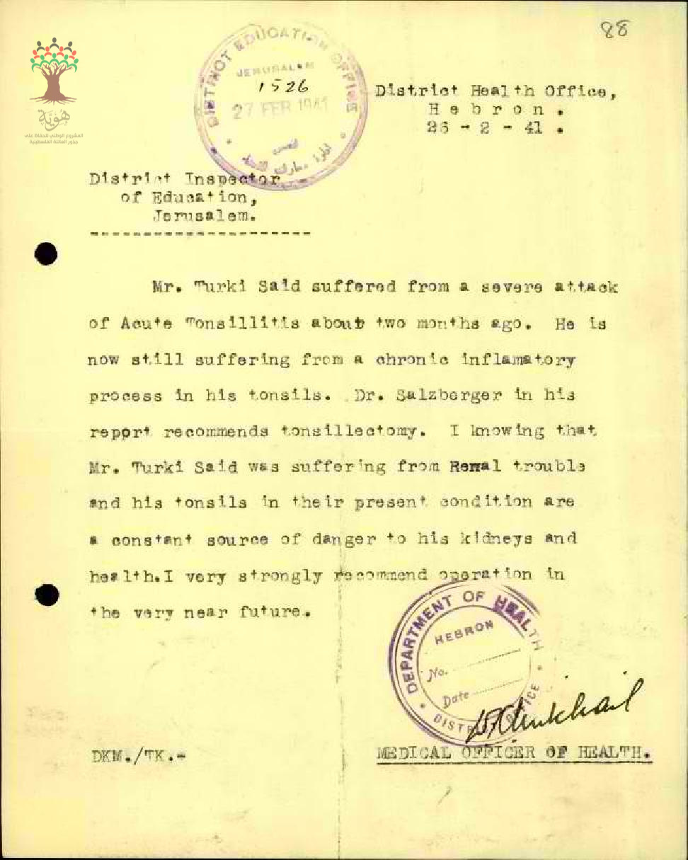 رسالة من طبيب ادارة المعارف الى مفتش المعارف بخصوص حالة المعلم تركي سعيد الصحية