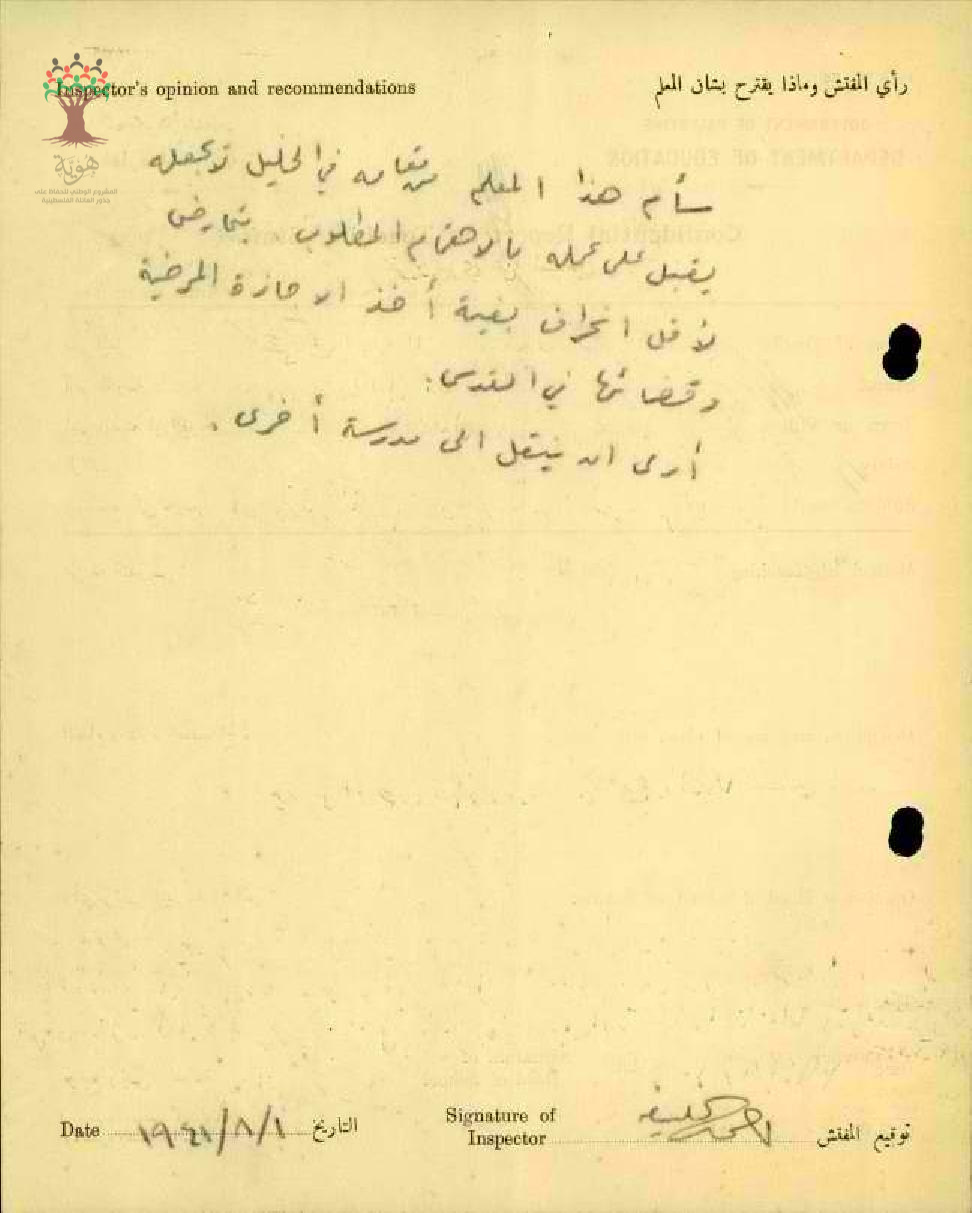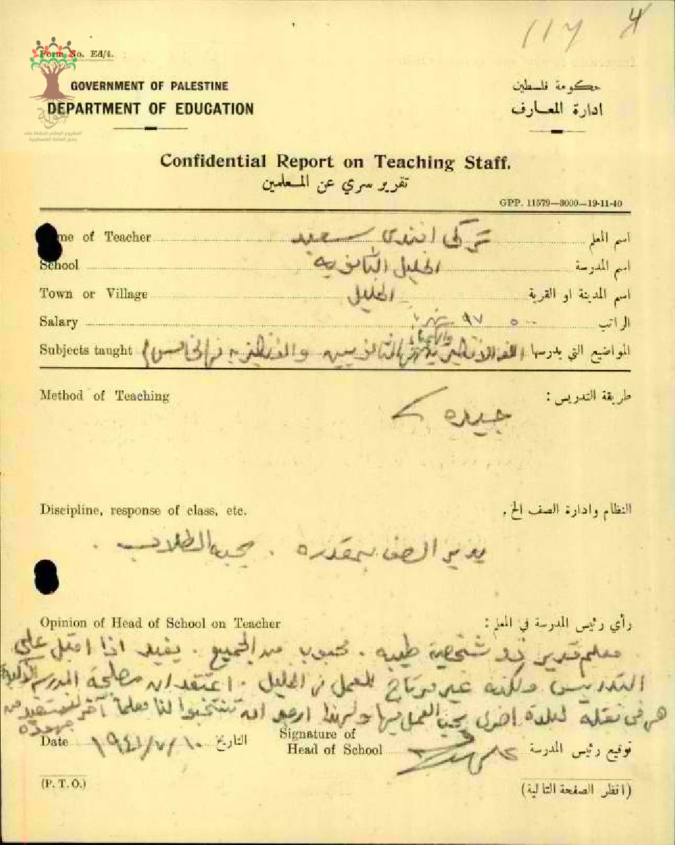 تقرير تفصيلي عن أداء المعلم تركي سعيد في مدرسة الخليل الثانوية سنة 1941