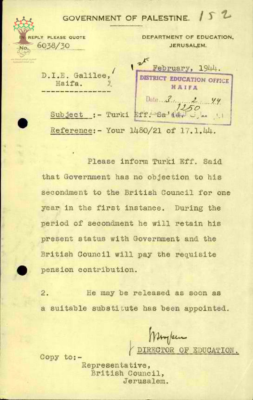 رسالة من مدير المعارف الى مفتش المعارف بخصوص موافقة الحكومة على ايعاز المعلم تركي سعيد الى المجلس البريطاني