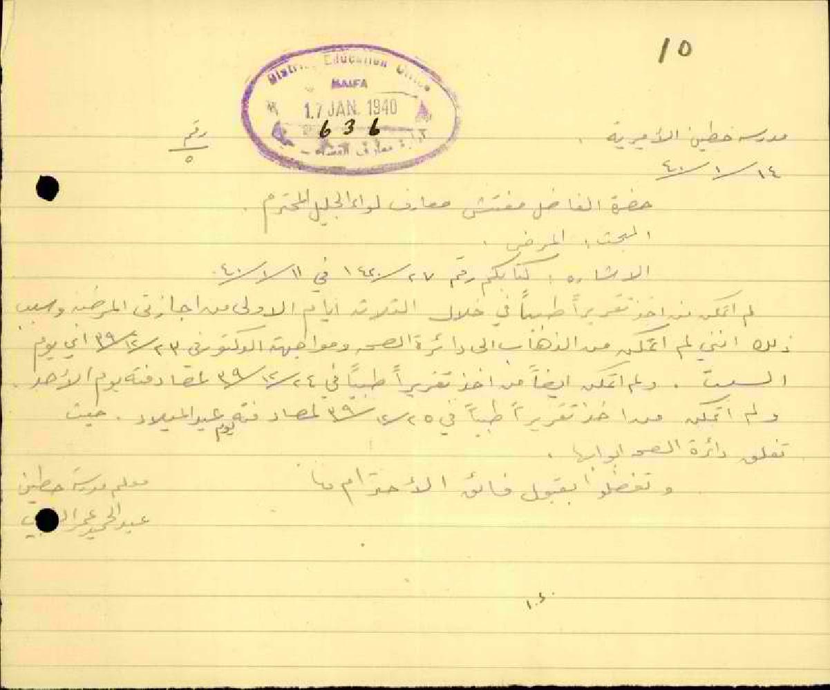 رسالة من المعلم عبد الحميد الزعبي الى مفتش المعارف يخبره بأنه لم يتمكن من الحصول على التقرير الطبي بسبب المرض