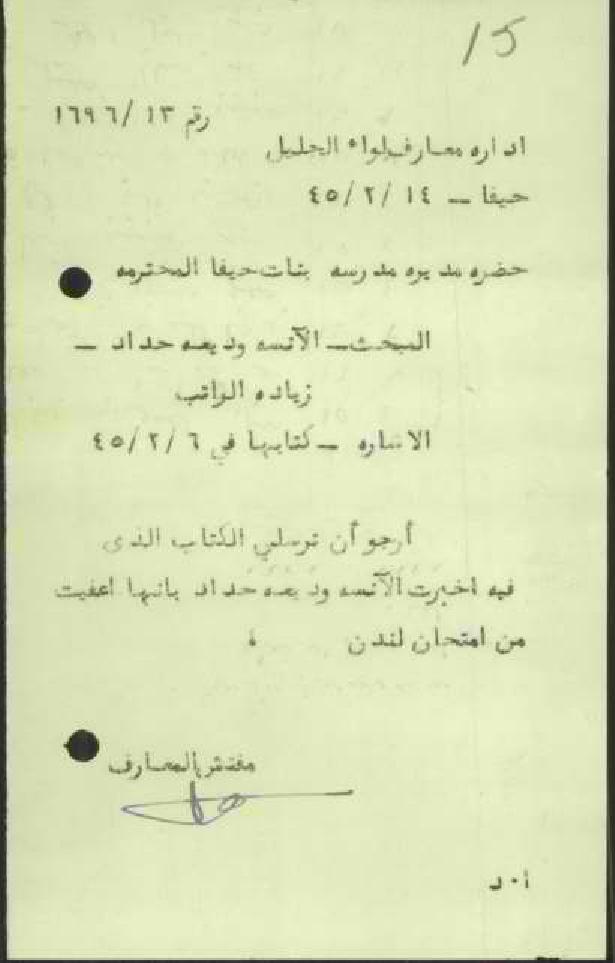 رسالة من مفتش المعارف الى المعلمة وديعة حداد يطلب فيها نسخة عن رسالة اعفائها من امتحان لندن مترك