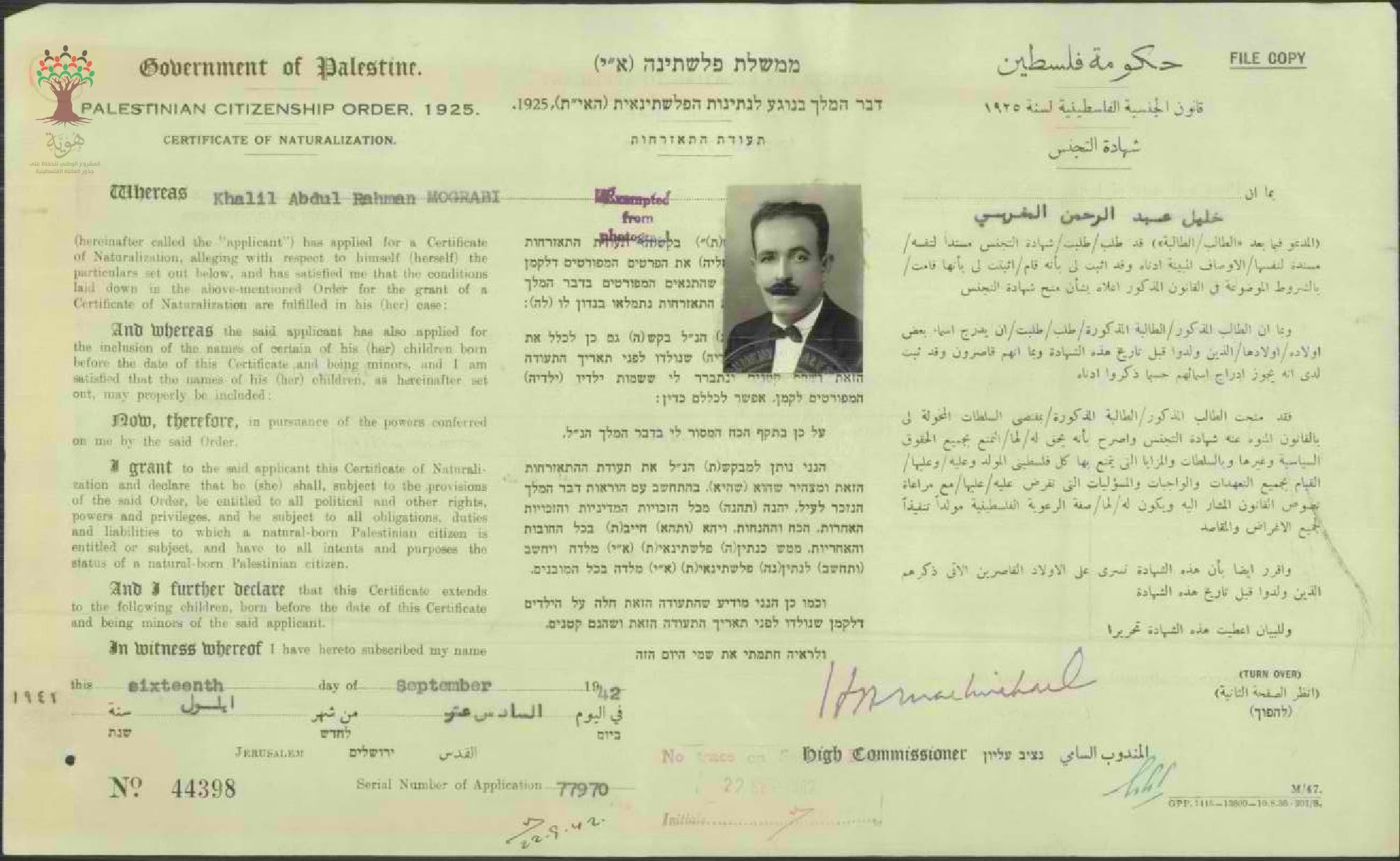 شهادة الجنسية الفلسطينية - خليل عبد الرحمن المغربي