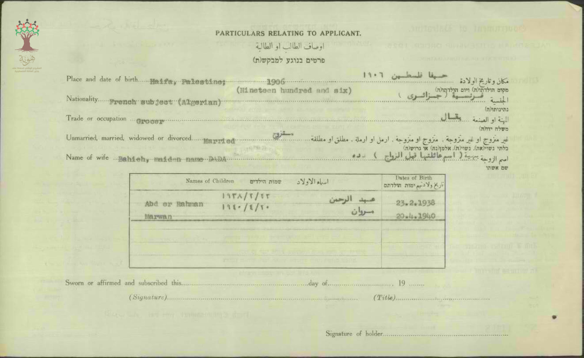مواليد حيفا 1906 يعمل بقال ومتزوج من بهية دادا