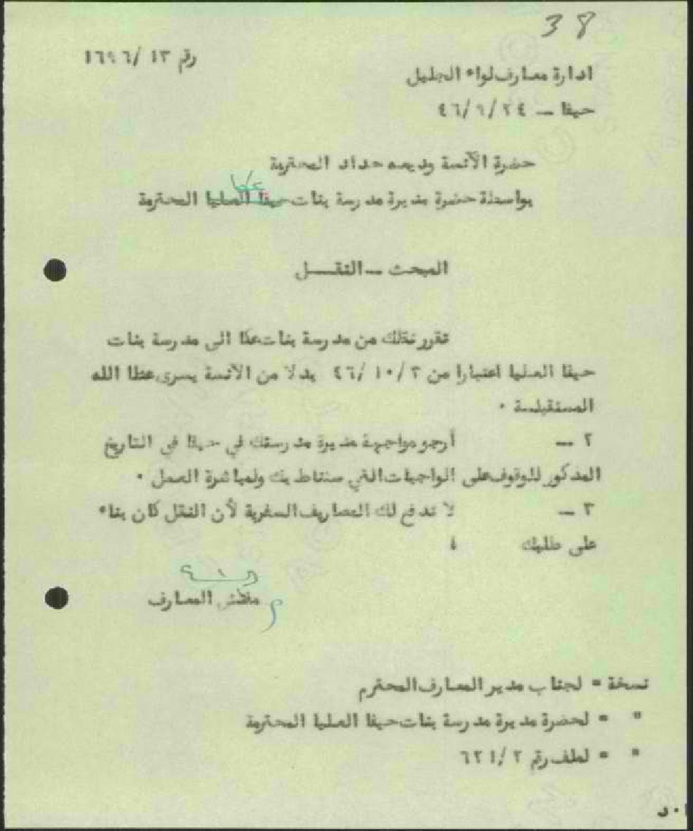رسالة من مفتش المعارف الى المعلمة وديعة حداد بخصوص نقلها من مدرسة بنات عكا الى مدرسة بنات حيفا
