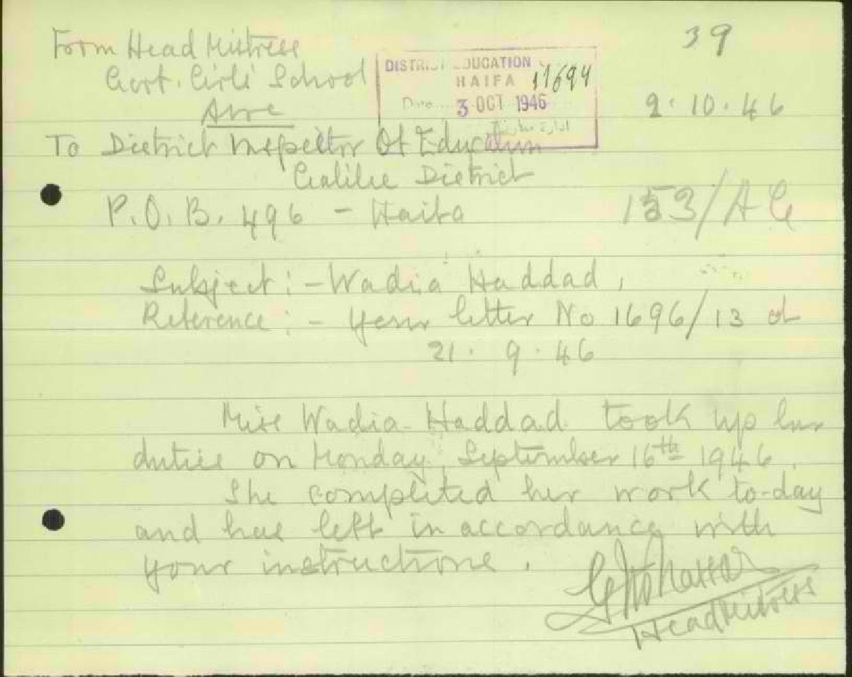 رسالة من مديرة مدرسة حيفا الى مفتش المعارف تخبره بأن المعلمة وديعة حداد قد باشرت عملها