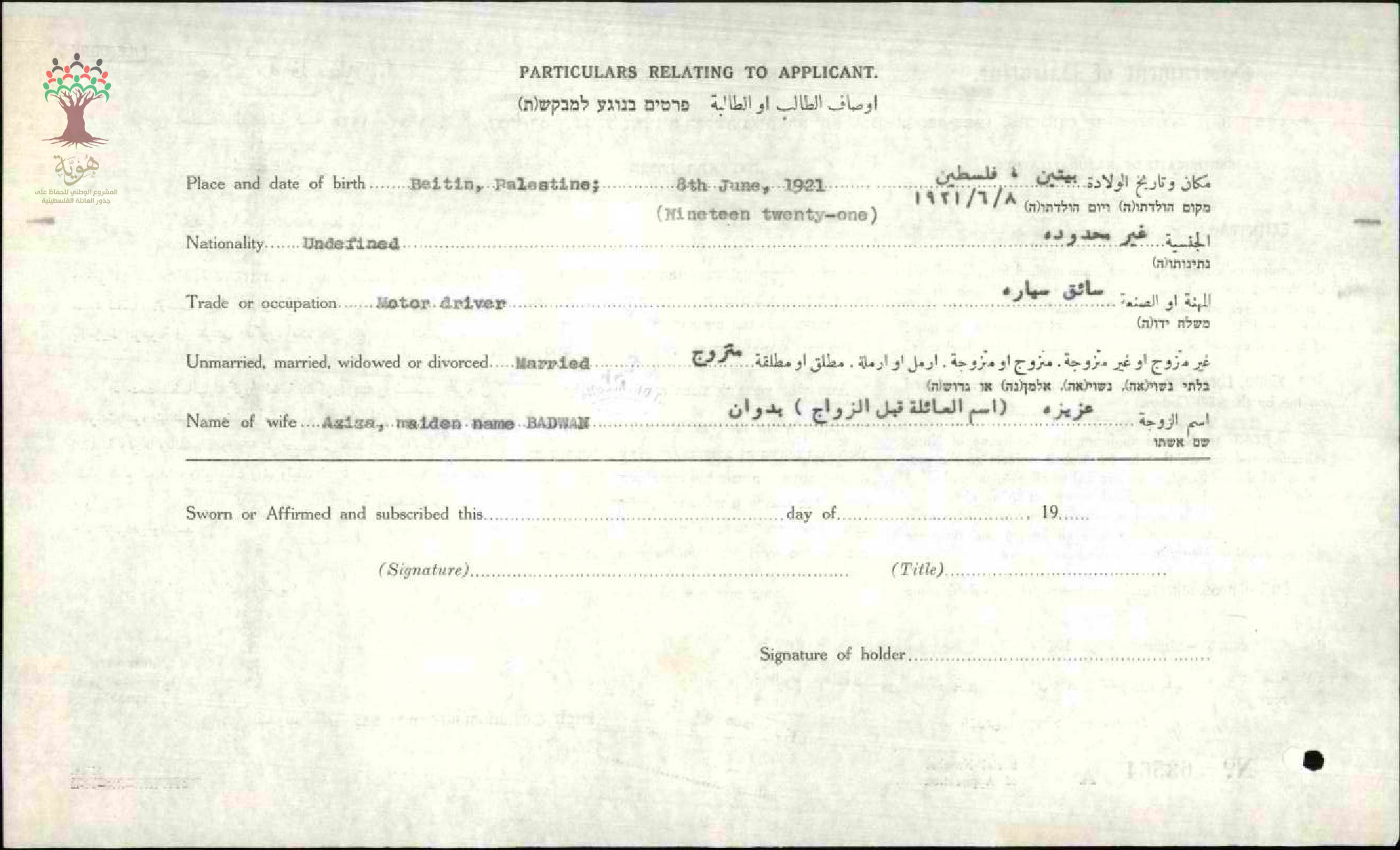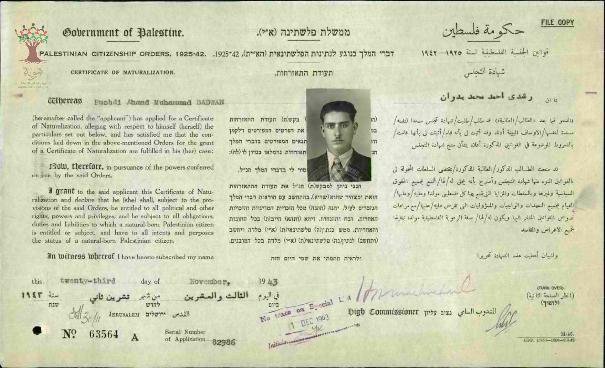 شهادة الجنسية الفلسطينية لرشدي أحمد محمد بدوان