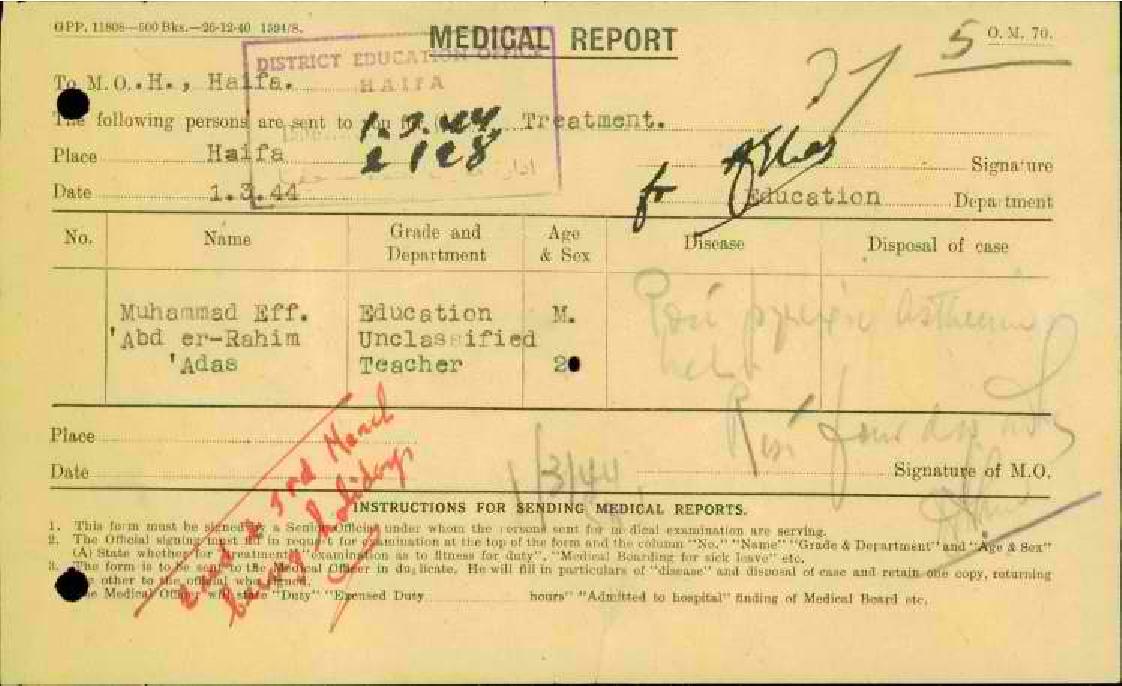 رسالة من المعلم محمد عدس الى مفتش المعارف بخصوص تغيبه عن العمل مرفقة بالتقارير الطبية