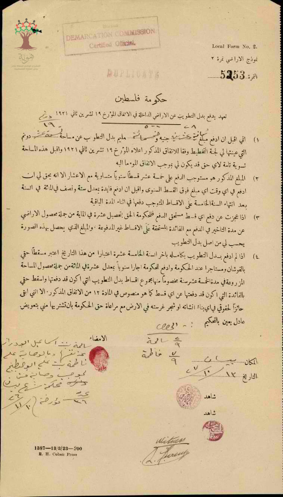 تعهد بدفع تطويب أرض سالمة اسماعيل أبو دراز وفاطمة علي محمود أبو البطيخ في بيسان