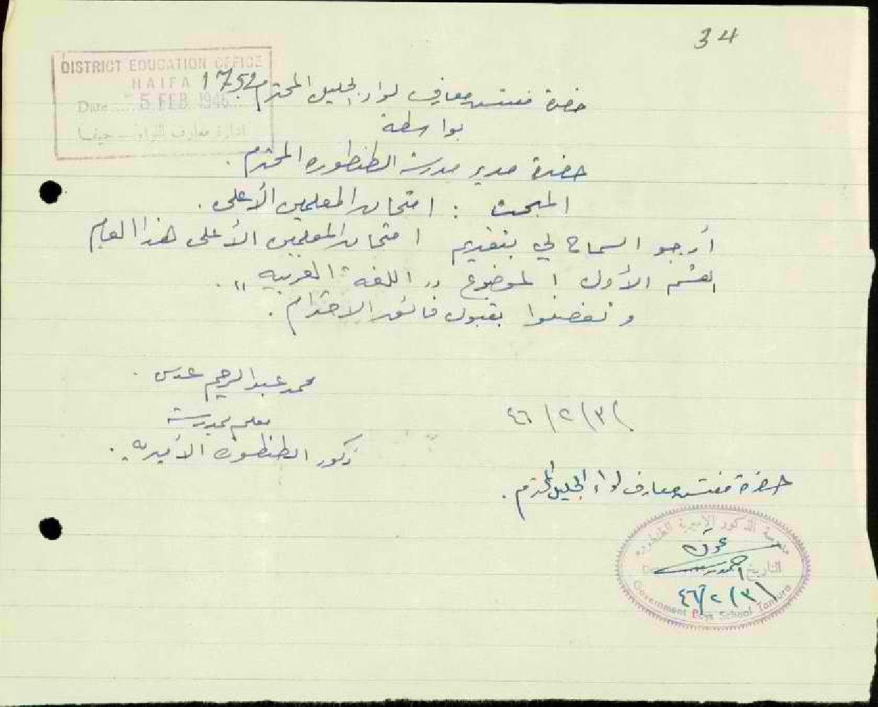 رسالة من المعلم محمد عدس الى مفتش المعارف يطلب السماح له بتقديم امتحان المعلمين الأعلى