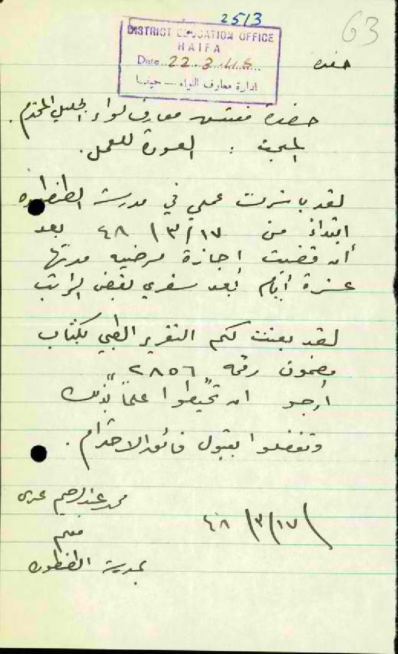 رسالة من المعلم محمد عدس الى مفتش المعارف بخصوص عودته الى العمل