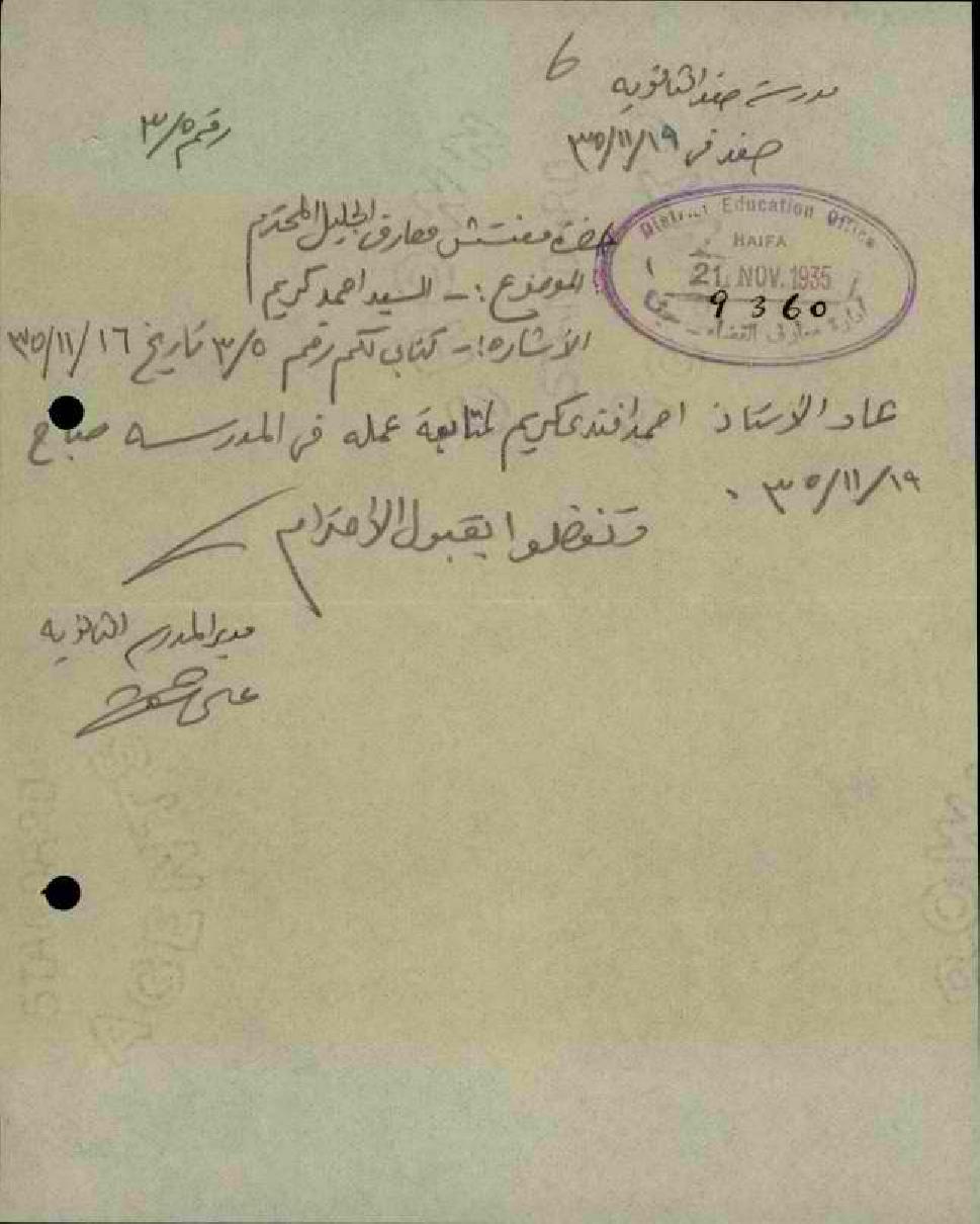 رسالة من مدير مدرسة صفد الى مفتش المعارف بخصوص عودة المعلم أحمد كريّم الى العمل