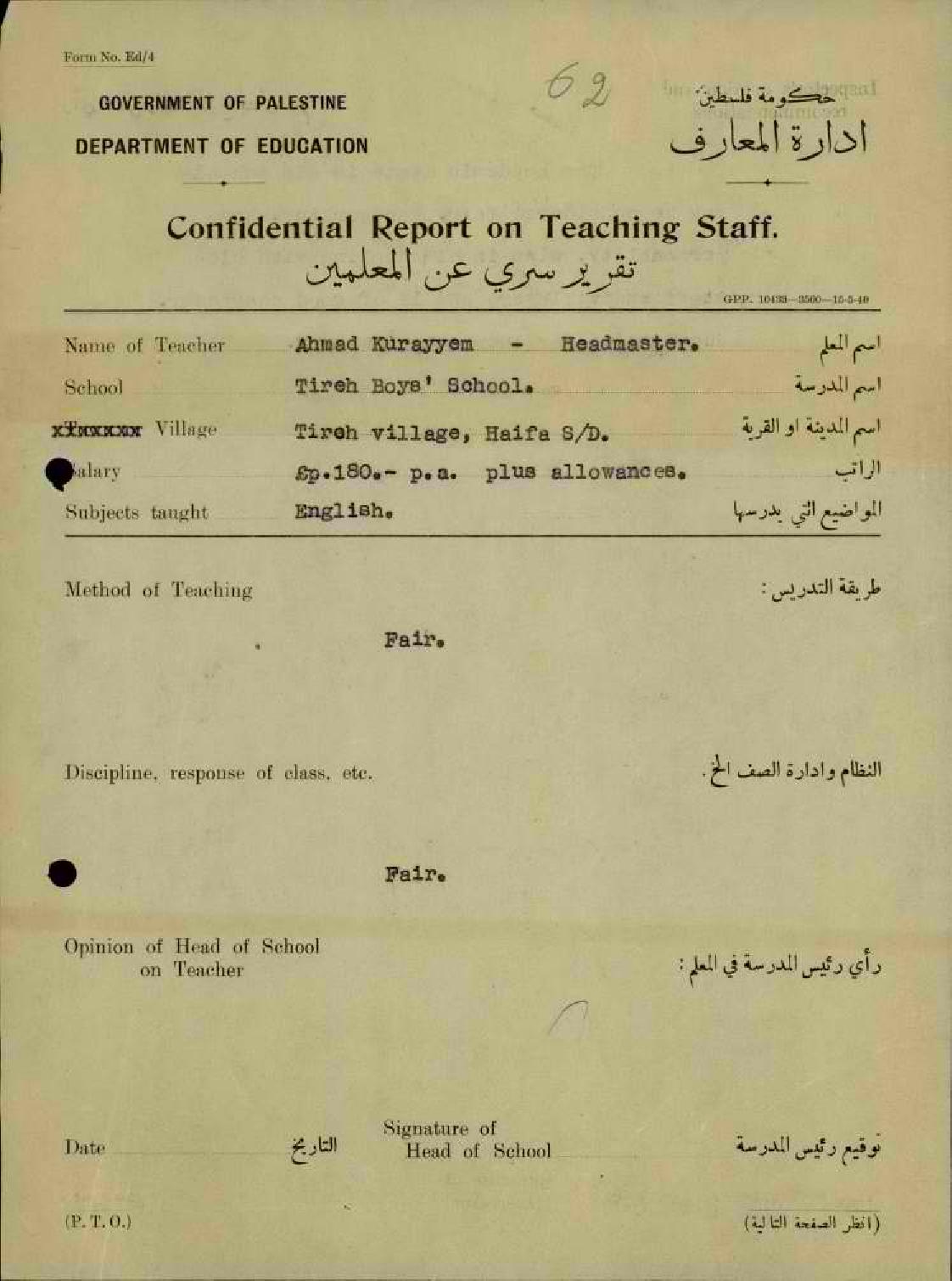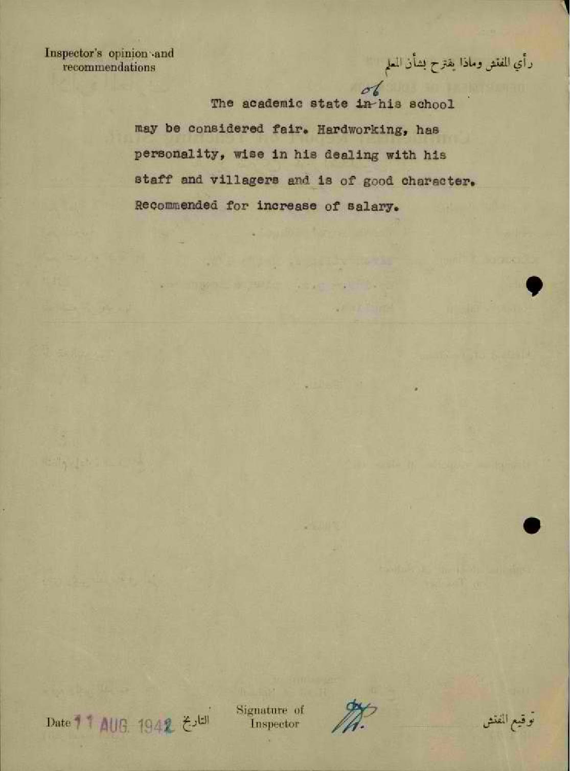 تقرير تفصيلي عن أداء المعلم أحمد كريّم في مدرسة طيرة حيفا سنة 1942