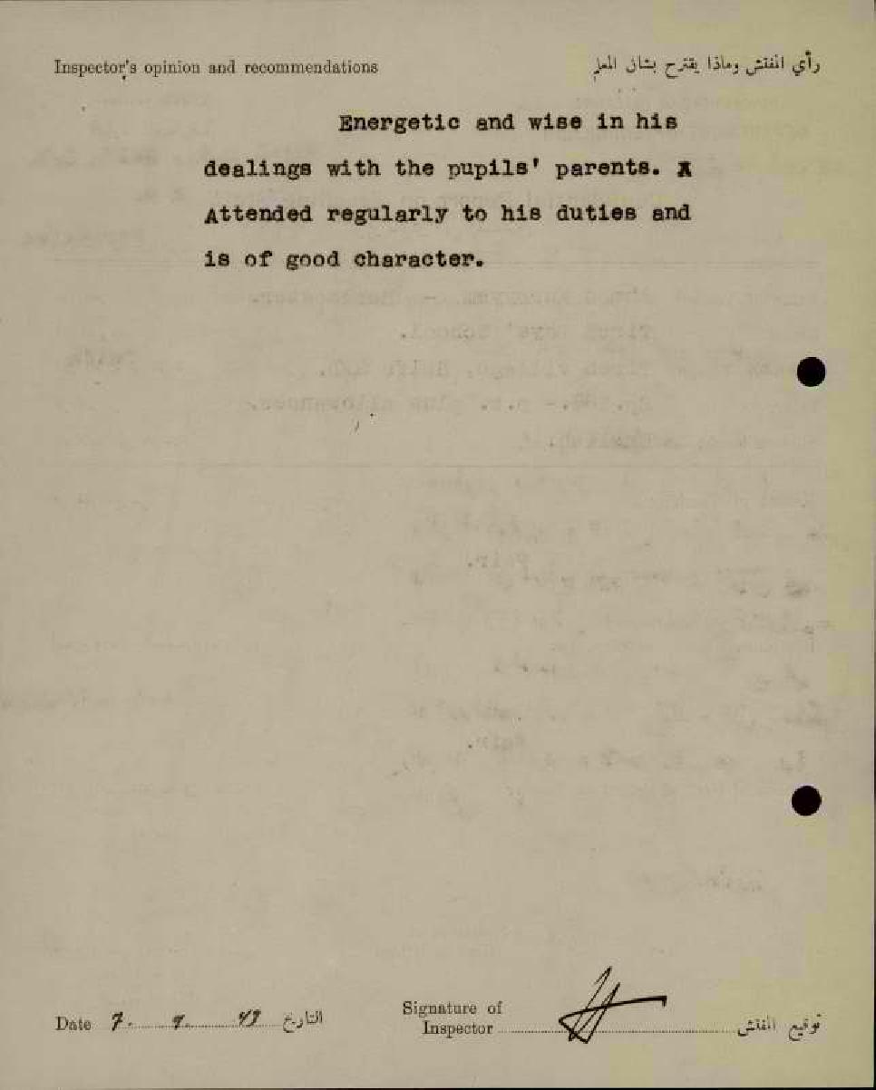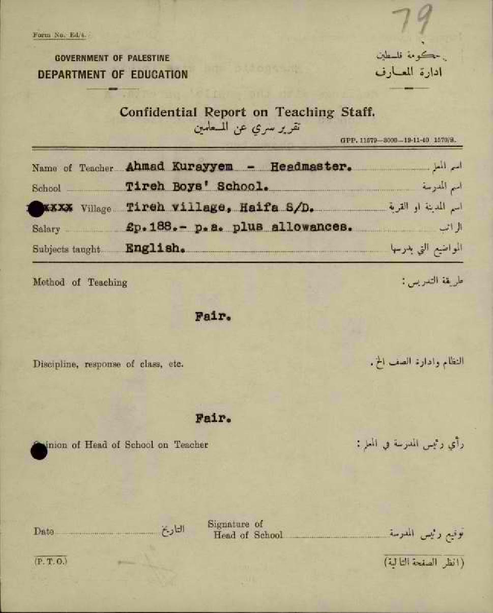 تقرير تفصيلي عن أداء المعلم أحمد كريّم في مدرسة طيرة حيفا سنة 1943