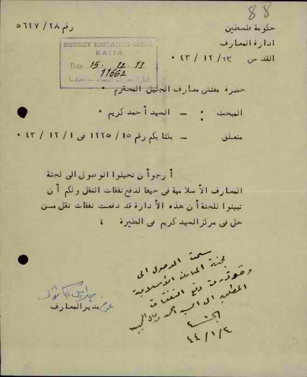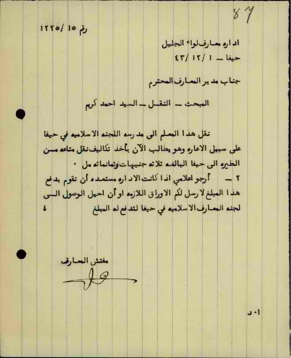 رسائل بخصوص تكاليف نقل المعلم أحمد كريّم من الطيرة الى حيفا