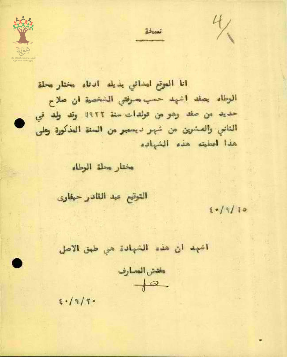 رسالة من مفتش المعارف الى المعلم صلاح حديد مرفقة بشهادة ميلاده