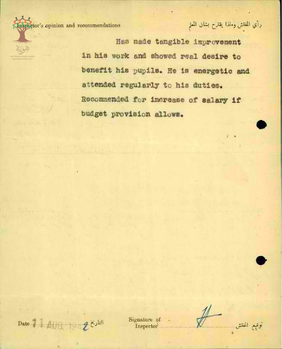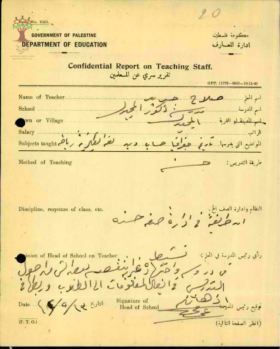 تقرير تفصيلي عن أداء المعلم صلاح حديد في مدرسة المجيدل سنة 1942