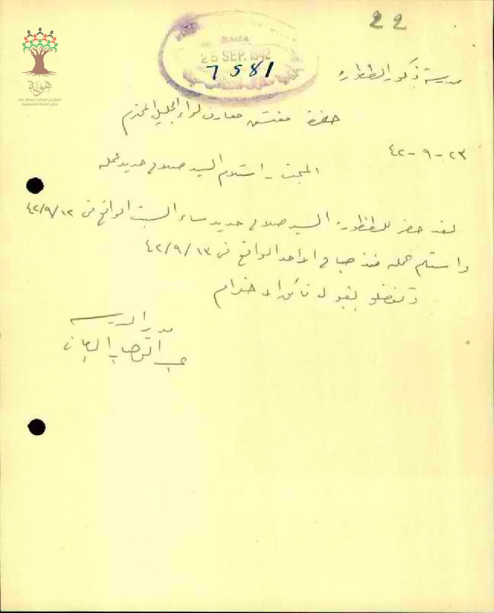 رسالة من مدير مدرسة الطنطورة الى مفتش المعارف يخبره بأن المعلم صلاح حديد قد باشر عمله