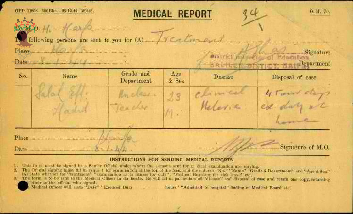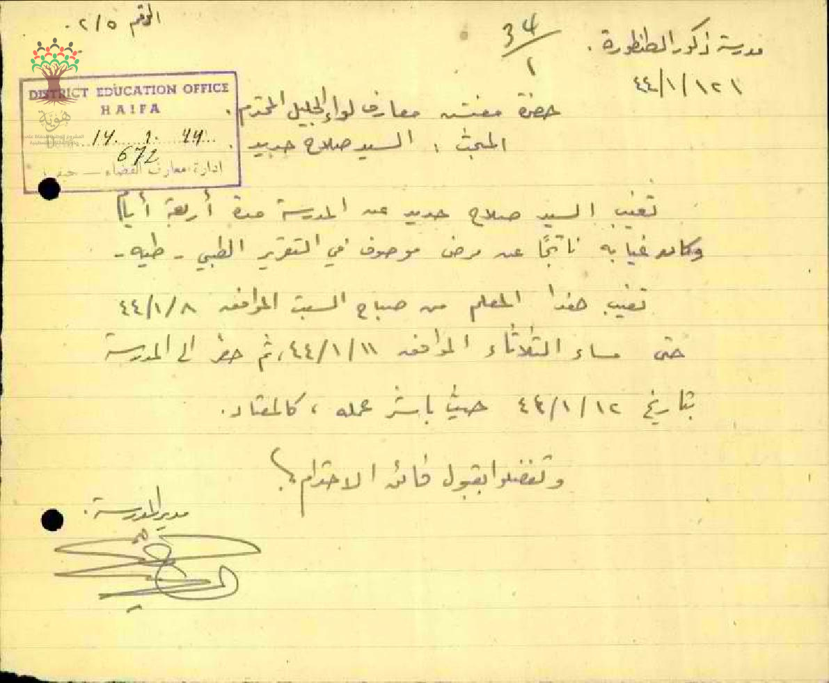 رسالة من مدير مدرسة الطنطورة الى مفتش المعارف بخصوص تغيب المعلم صلاح حديد مرفقة بالتقرير الطبي