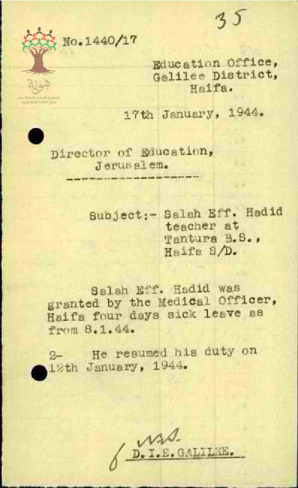 رسالة من مفتش المعارف الى مدير المعارف بخصوص اجازة مرضية للمعلم صلاح حديد وعودته للعمل