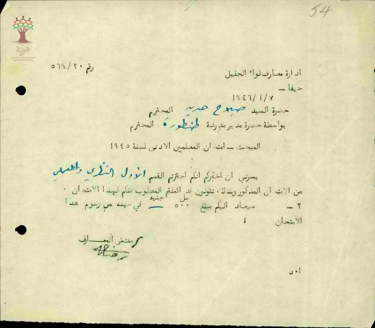 رسالة من مفتش المعارف الى المعلم صلاح حديد يخبره بأنه قد اجتاز القسم الأول النظري والعلمي امتحان المعلمين الأدنى لسنة 1945
