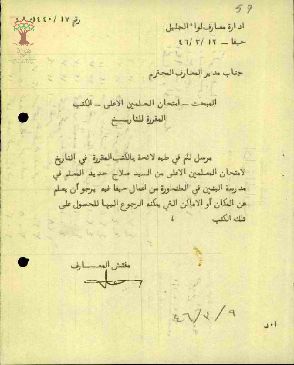 رسالة من مفتش المعارف الى المعلم صلاح حديد بخصوص الكتب المقررة لامتحان المعلمين الأعلى