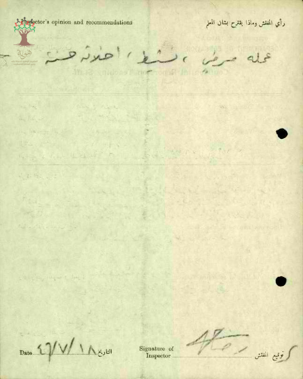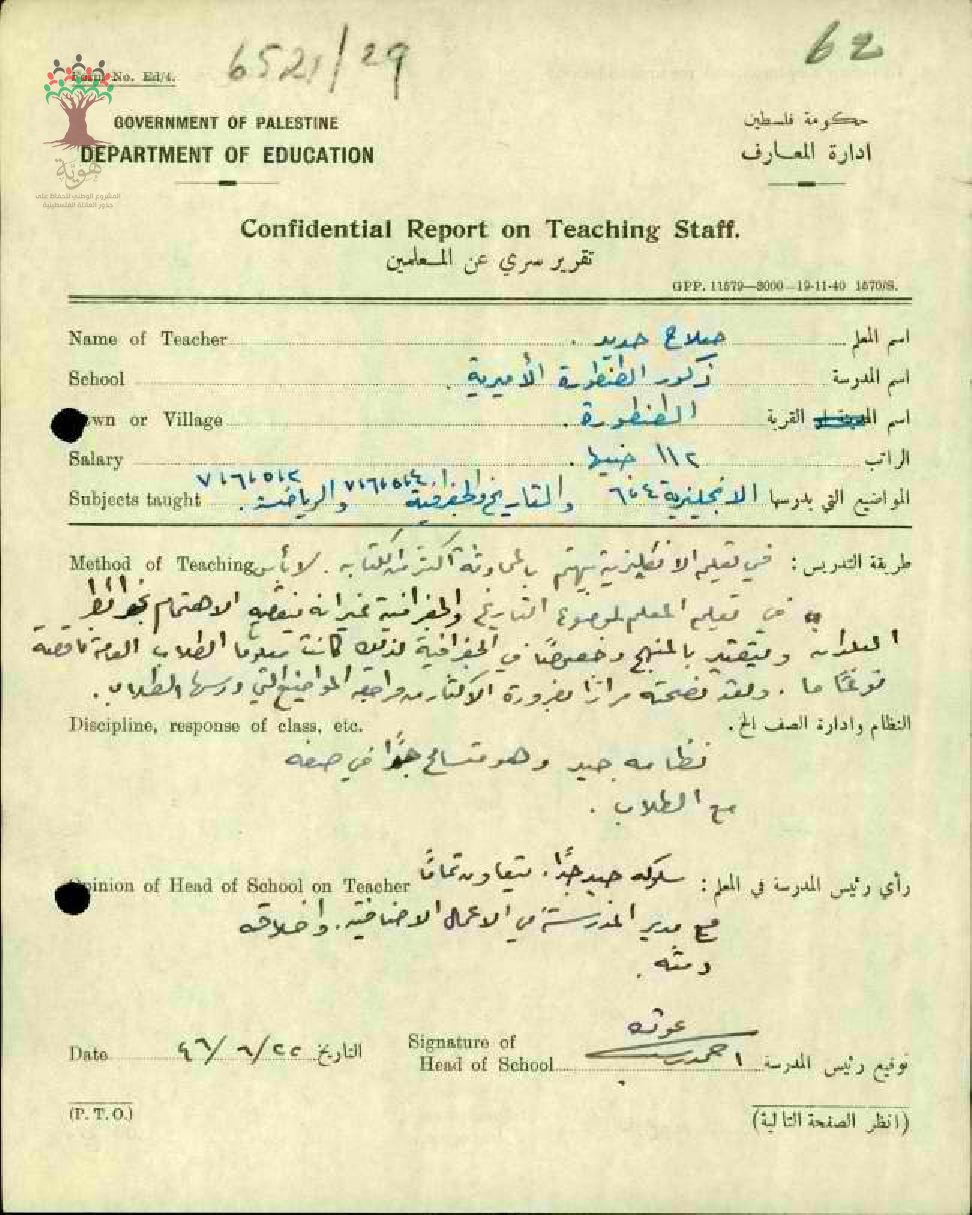 تقرير تفصيلي عن أداء المعلم صلاح حديد في مدرسة الطنطورة سنة 1946