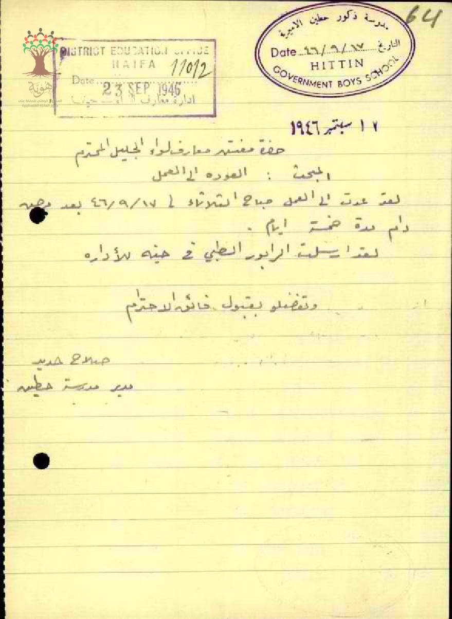 رسالة من المعلم صلاح حديد الى مفتش المعارف بخصوص تغيبه عن العمل بسبب المرض وعودته الى العمل