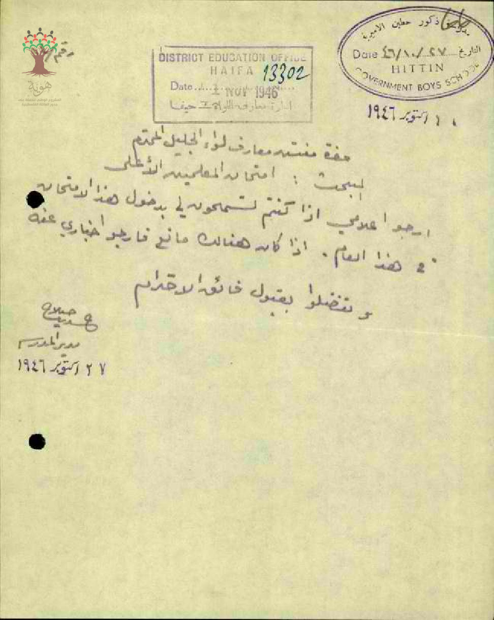 رسالة من المعلم صلاح حديد الى مفتش المعارف يسأل اذا كان بامكانه تقديم امتحان المعلمين الأعلى