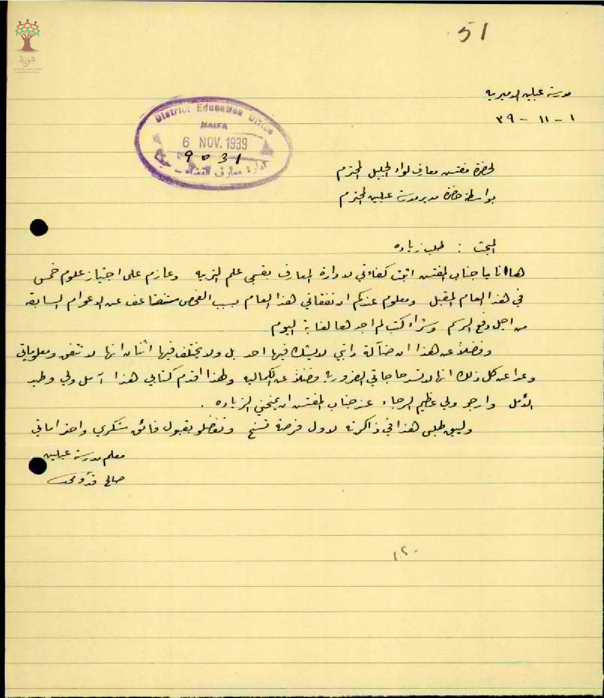 طلب زيادة مرتب مقدم من قبل المعلم صالح عبد الحليم القدومي - كفر قدوم - مدرسة اعبلين
