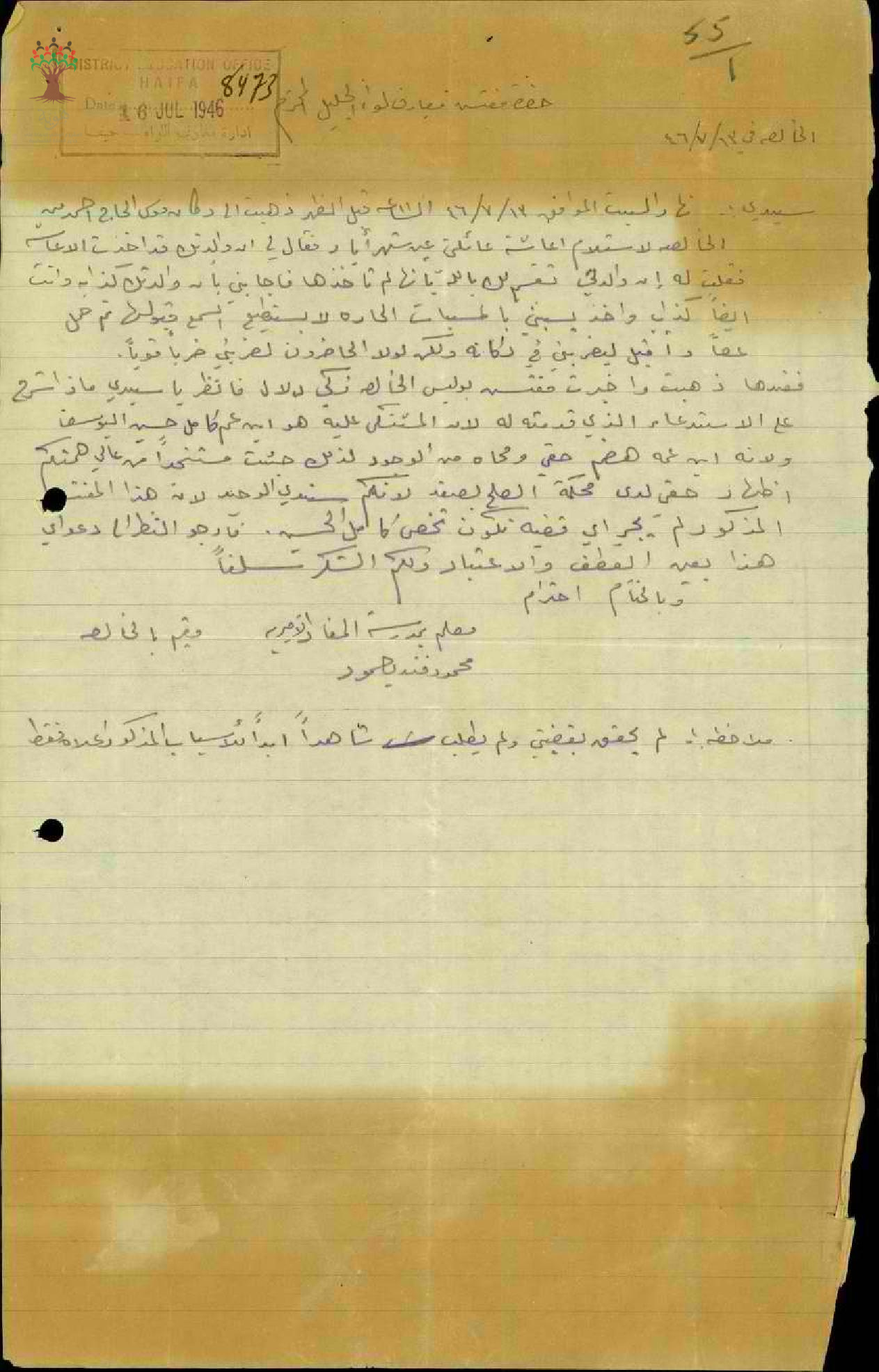 شكوى من الاستاذ محمود فندي حمود الى مفتش دائرة المعارف في الجليل