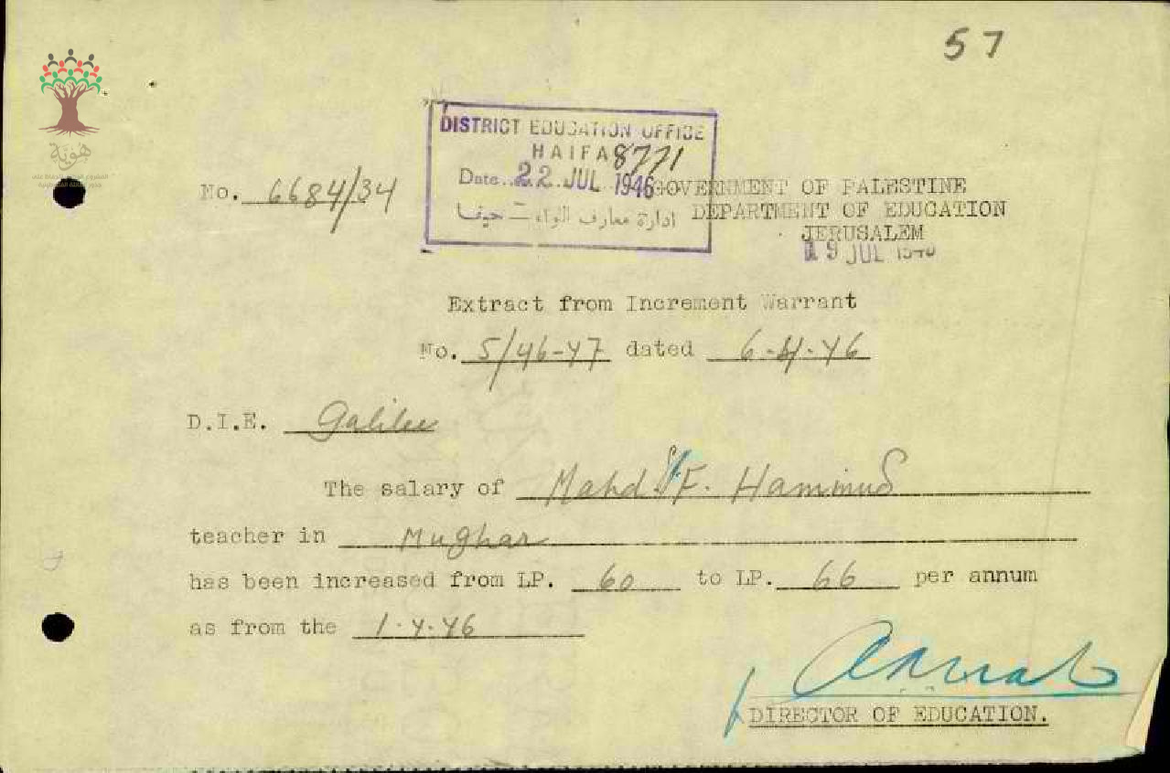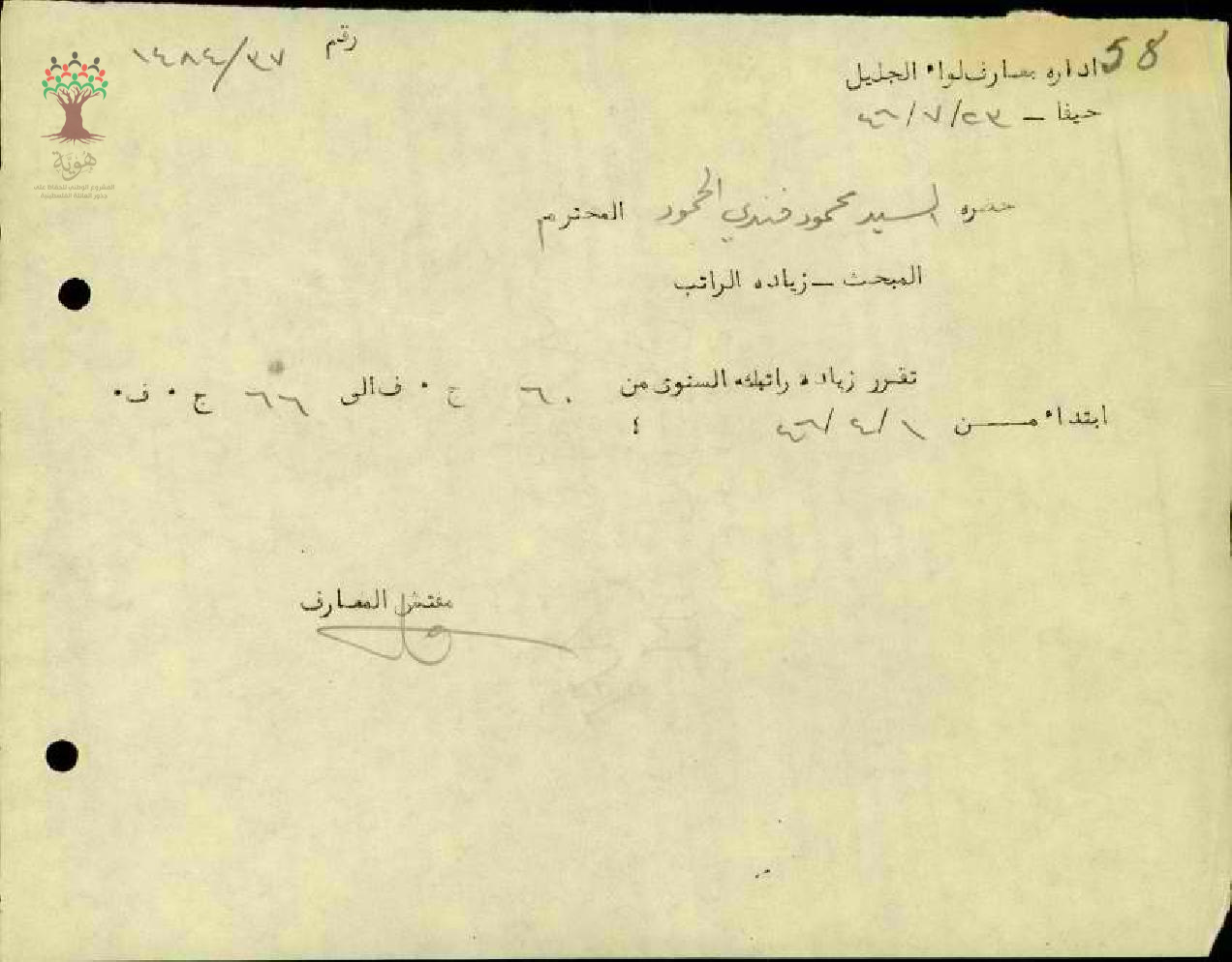 ابلاغ بزيادة مرتب الاستاذ محمود فندي حمود من 60 الى 66 جنيه فلسطيني