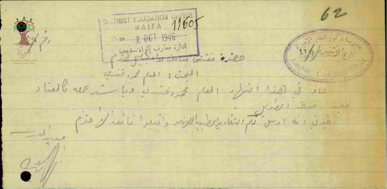 ابلاغ مفتش معارف الجليل بعودة المعلم محمود فندي حمود لممارسة مهامه في مدرسة ذكور المغار الأميرية - الخالصة