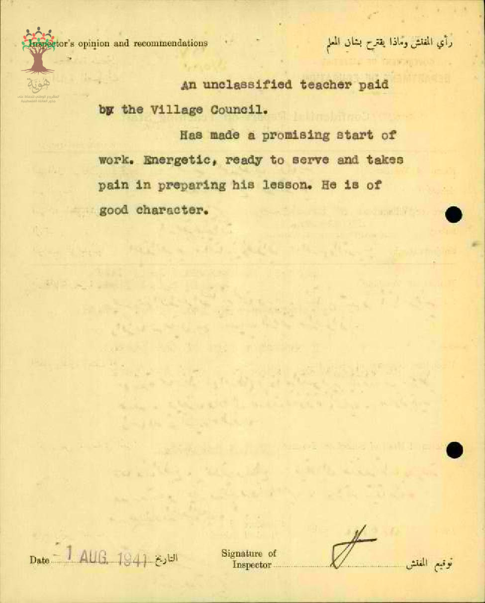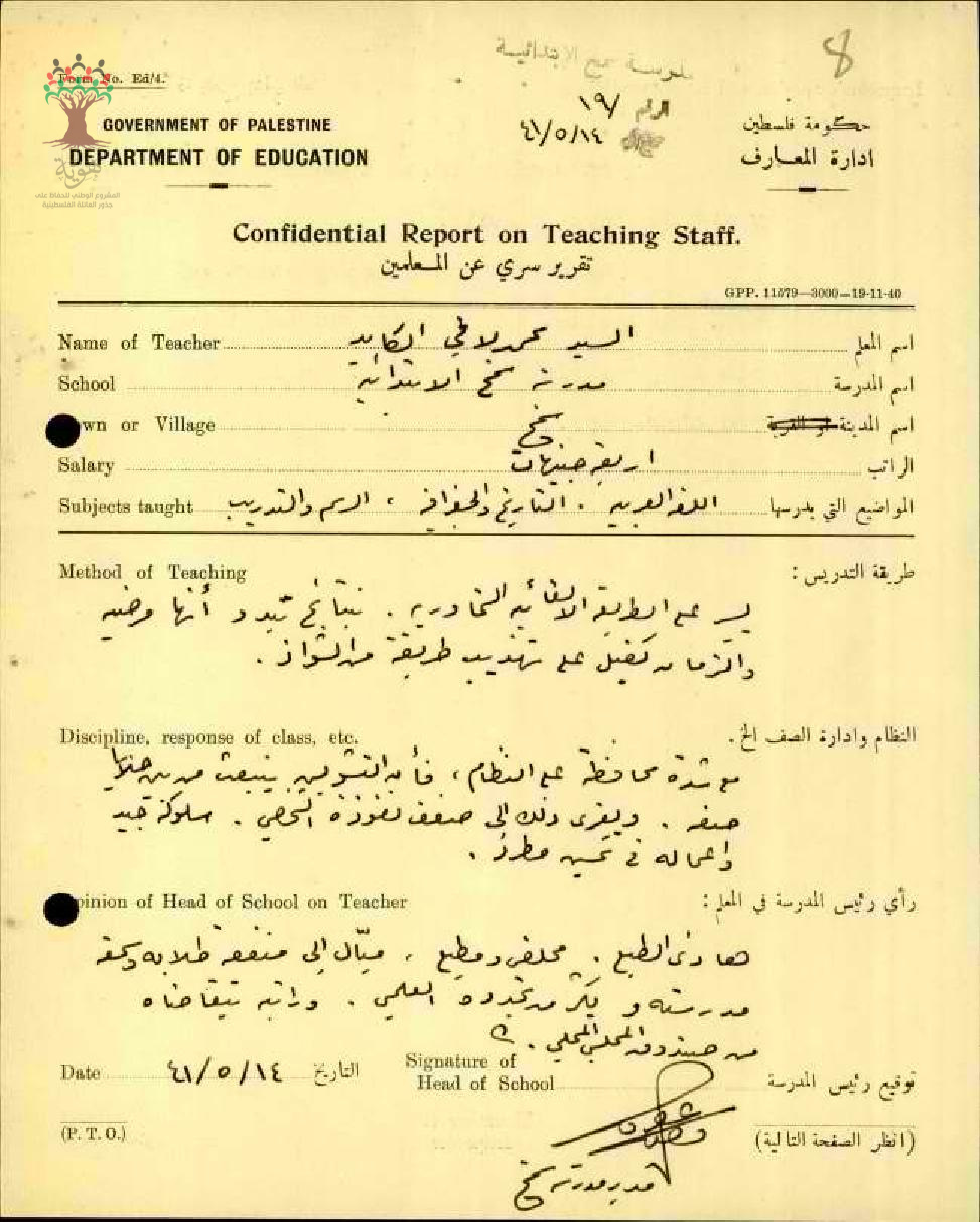 تقرير تفصيلي عن أداء المعلم محمد لافي كايد في مدرسة سمخ سنة 1941