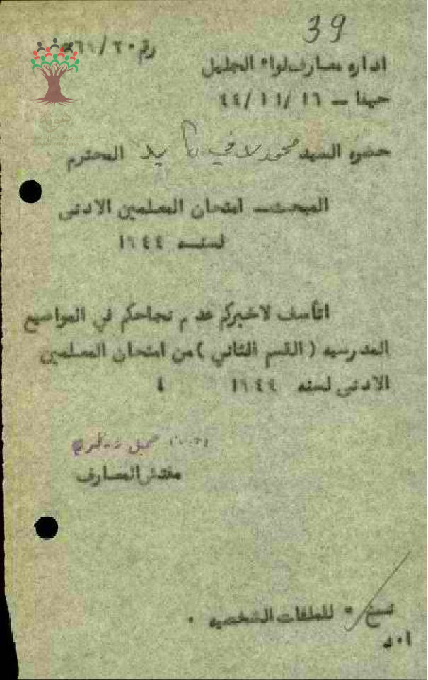 رسالة من مفتش المعارف الى المعلم محمد كايد يخبره بأنه لم ينجح في امتحان المعلمين الأدنى لسنة 1944