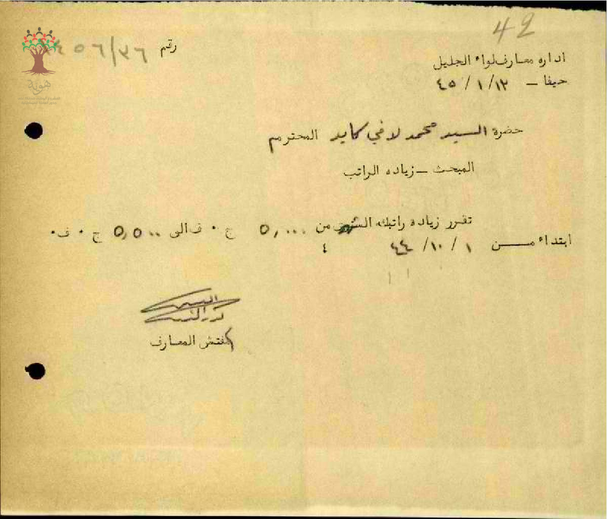 رسالة من مفتش المعارف الى المعلم محمد كايد بخصوص زيادة راتبه السنوية