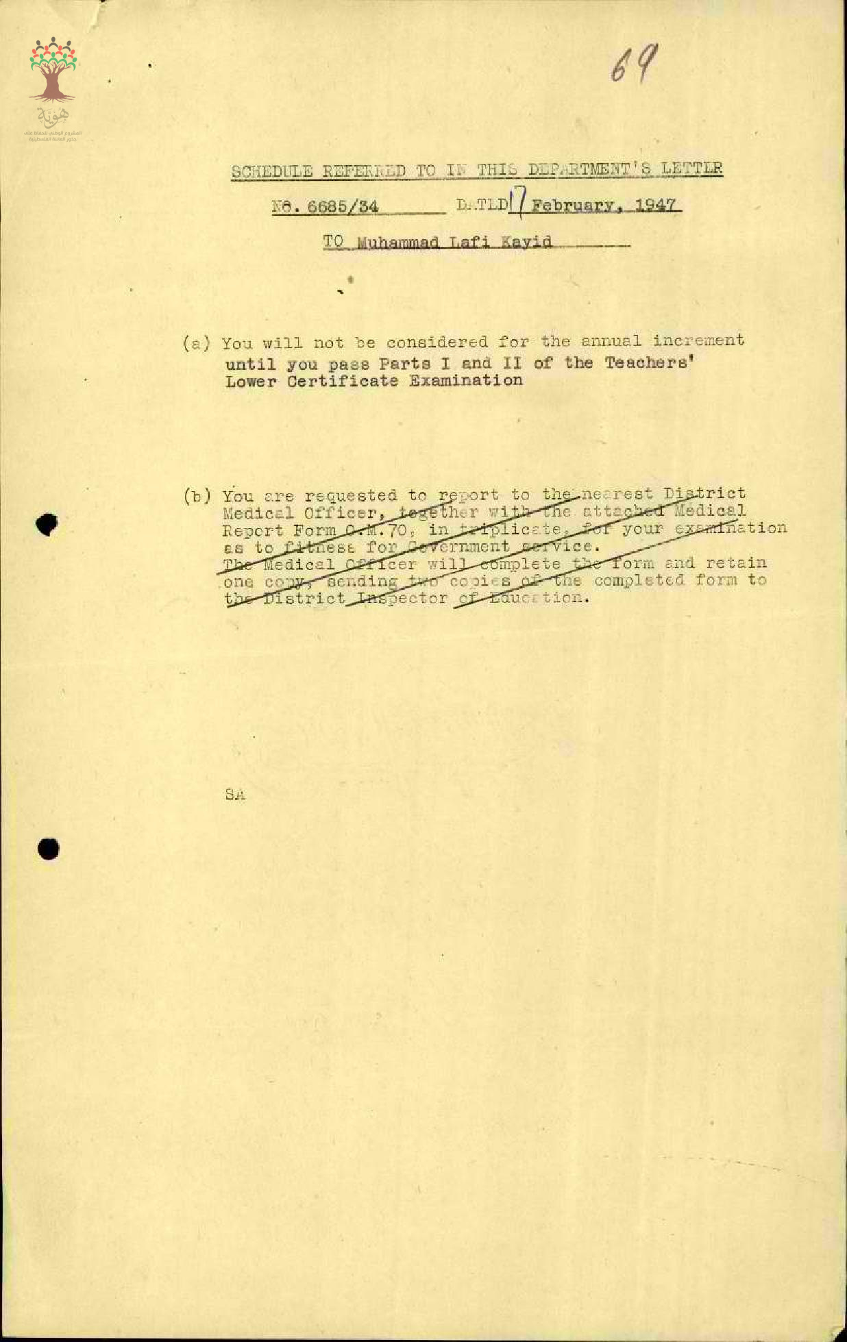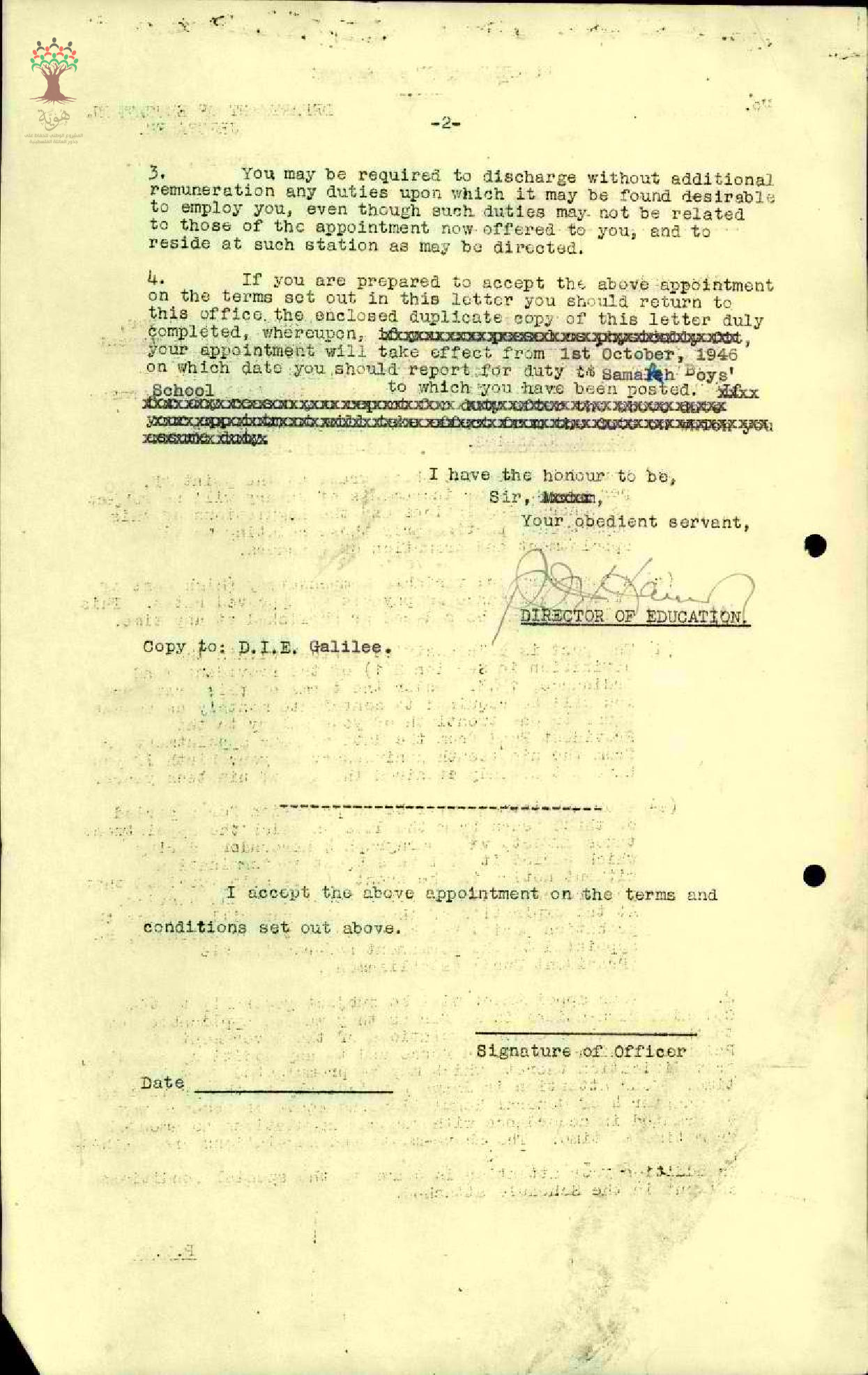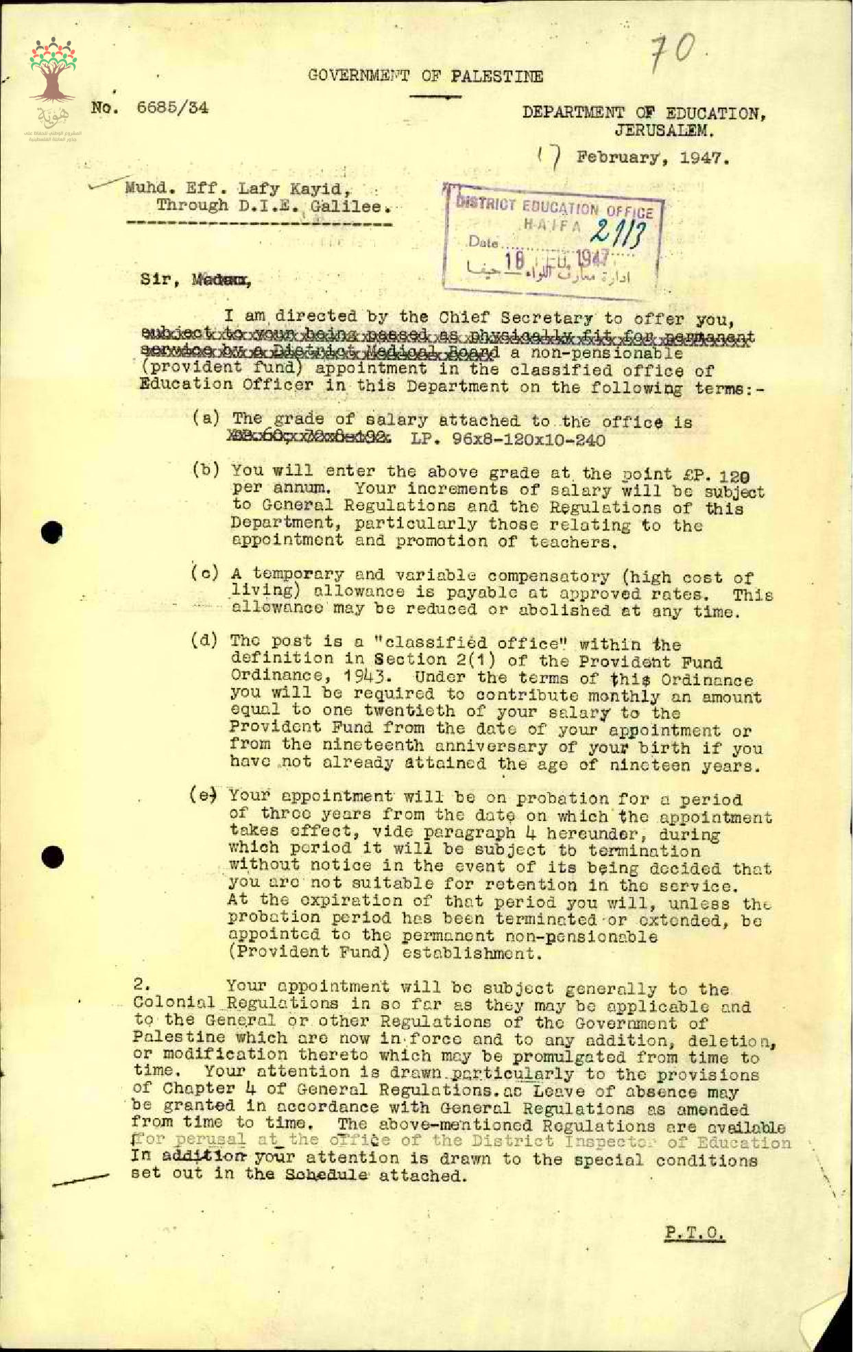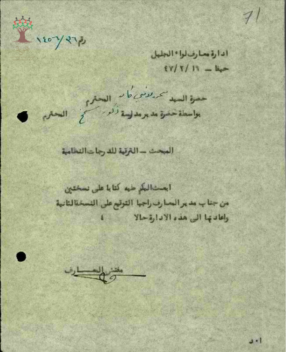 رسالة من مفتش المعارف الى المعلم محمد كايد مرفقة بنسخة شروط تعيينه في الدرجات النظامية للتوقيع عليها