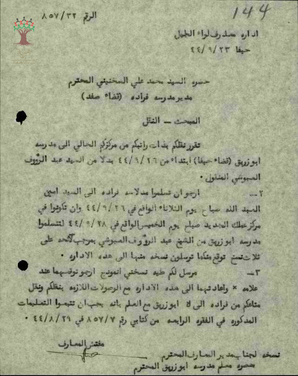 نقل المعلم محمد علي سخيني من مدرسة فرادى الى مدرسة ابو زريق