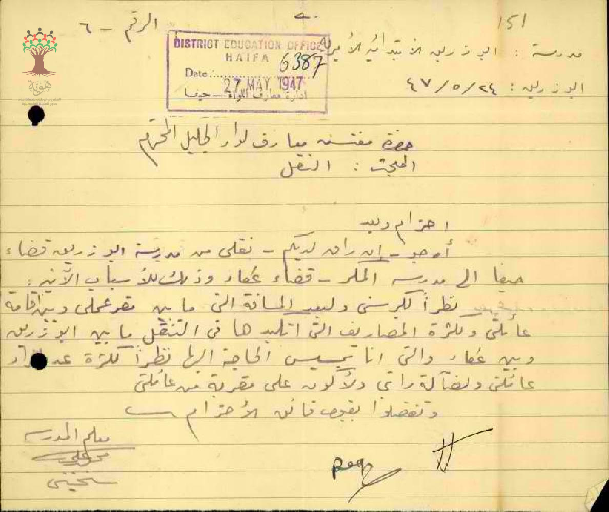 طلب نقل مقدم من المعلم محمد علي السخنيني من مدرسة ابو زريق الى مدرسة المكر