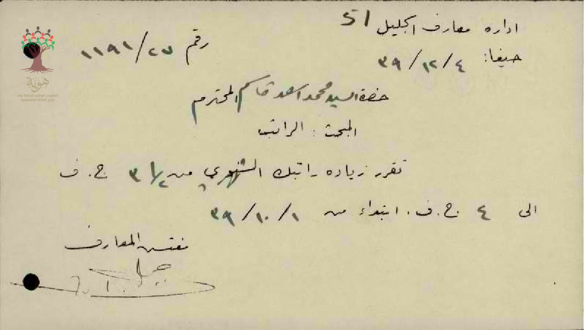 زيادة مرتب للمعلم محمد اسعد قاسم - دبورية - مدرسة الشجرة