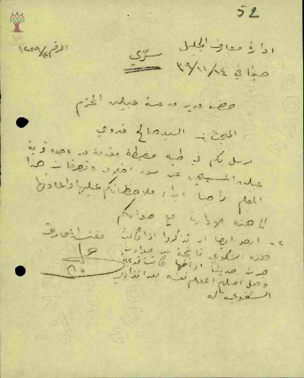 رسالة من مفتش دائرة المعارف الى مدير مدرسة عبلين بخصوص المعلم صالح عبد القدومي - كفر قدوم