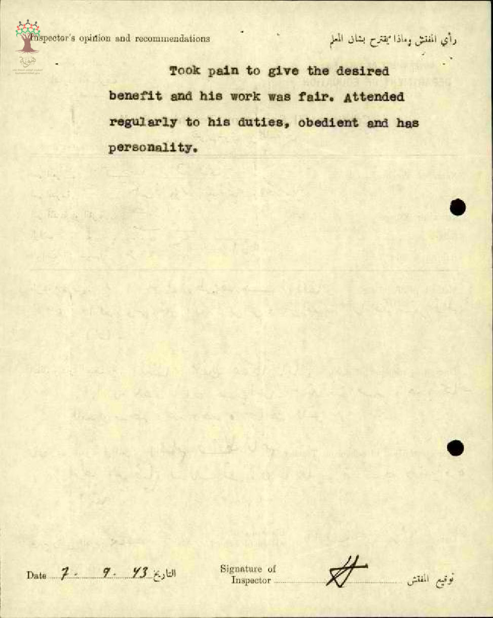 رأي المفتش العام بالمعلم صالح عبد الحليم القدومي - كفر قدوم - مدرسة طمرة